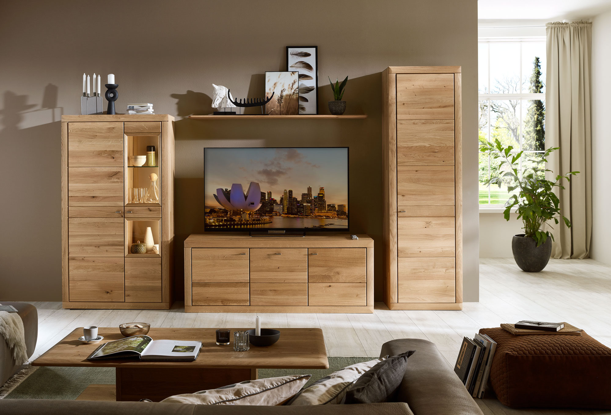 Auch bei Möbeln ist weniger oft mehr. Darum haben wir bei Aurum bewusst auf überflüssigen Zierrat verzichtet. Das zeitlose Design mit dem harmonischen Fugenspiel und den auflockernden Vitrinenelementen spricht für sich und lässt dabei die ganze Schönheit des massiven Eichenholzes voll zur Geltung kommen. Umrahmt werden die geradlinigen Einzelmöbel von einem leicht abgesofteten Rahmen, welcher der klaren Frontaufteilung als formvollendeter Abschluss dient. Die Vitrinenausschnitte ordnen sich durch die abgeschrägte Form des Rahmens in einer etwas tieferen Ebene an. Die schlicht gehaltenen Frontflächen werden hierdurch wohltuend unterbrochen. Als weiteres Stilelement dieser besonderen Solisten, begeistert die softe Bürstung der Oberfläche mit einer wertigen Optik und feinen Haptik.