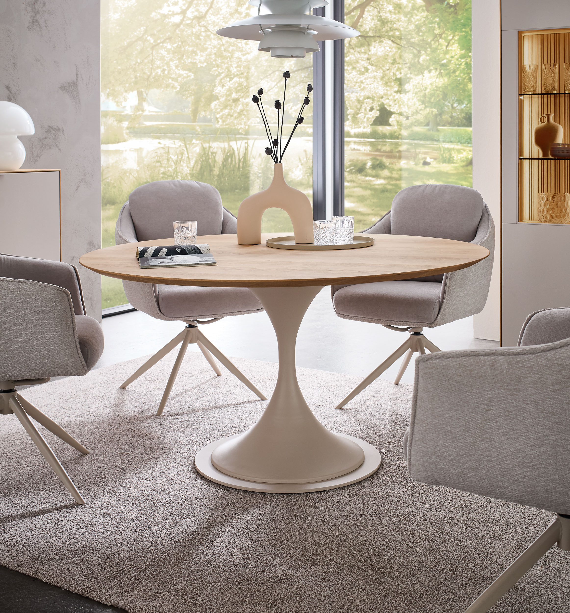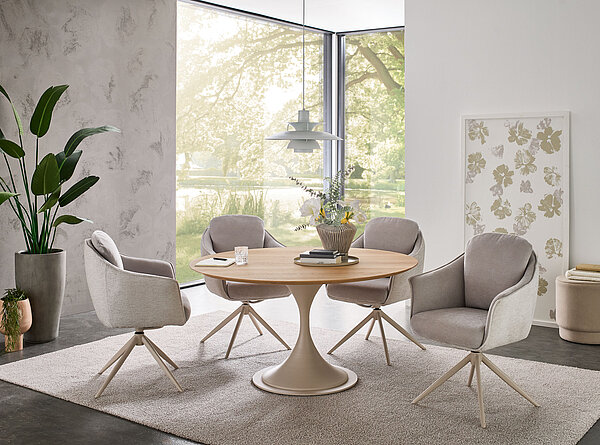 Unser Tisch TS 474 vereint natürliche Wärme mit modernem Design. Die hochwertige Massivholzplatte bringt die lebendige Struktur des Holzes perfekt zur Geltung und macht jeden Tisch zu einem Unikat. Getragen wird sie von einem filigranen Metallgestell im eleganten Farbton Perla, das dem Tisch eine leichte und zugleich stabile Ausstrahlung verleiht. Die runde Form schafft eine einladende Atmosphäre und bringt Menschen zusammen – ideal für gemeinsame Mahlzeiten, Gespräche und besondere Momente. Durch die Kombination aus natürlichem Holz und modernem Metall fügt sich der Tisch harmonisch in verschiedenste Wohnstile ein und setzt gleichzeitig einen stilvollen Akzent. Ein Tisch, der Design, Qualität und Natürlichkeit auf besondere Weise verbindet.