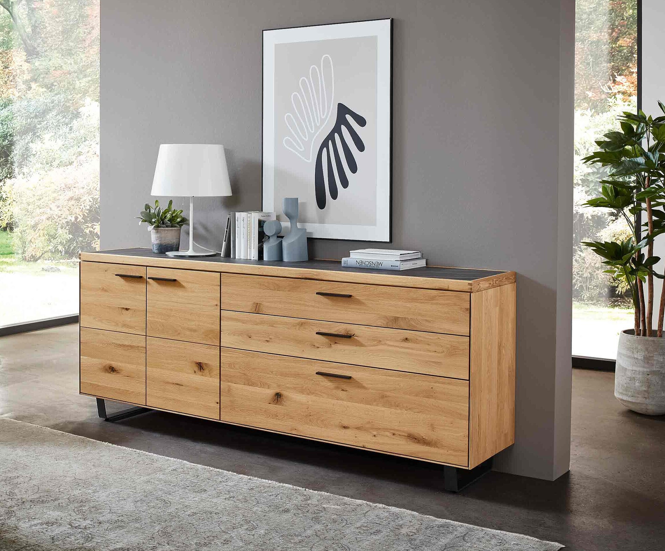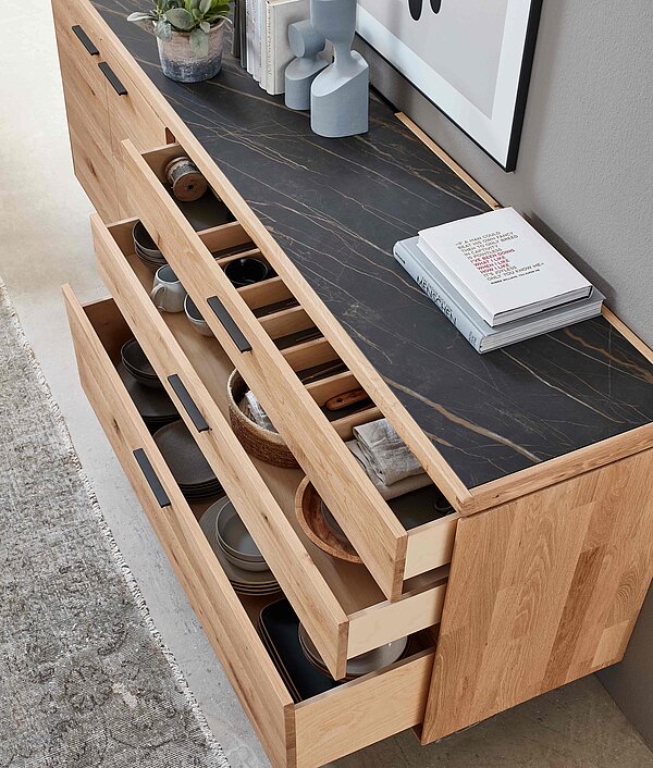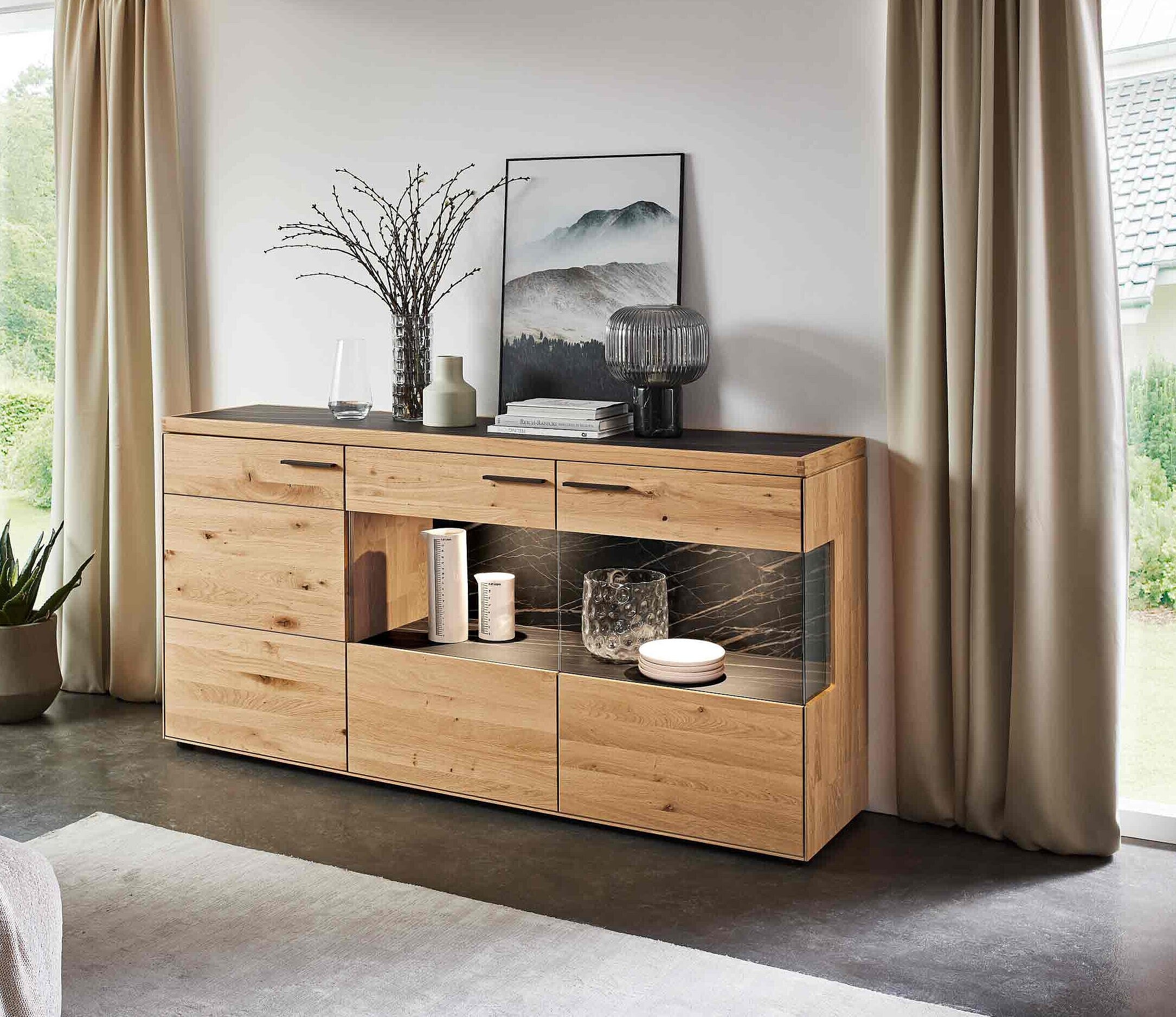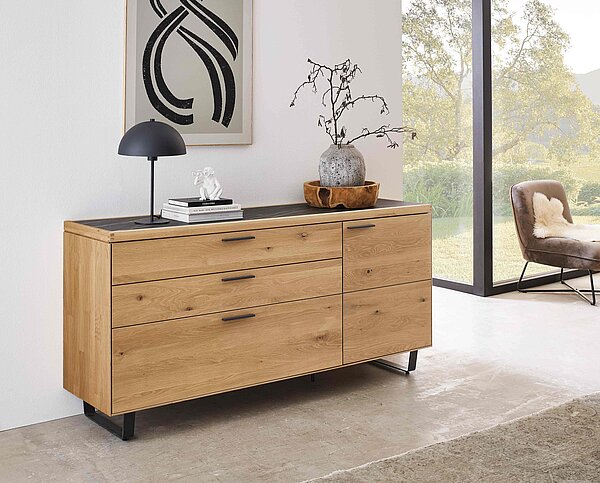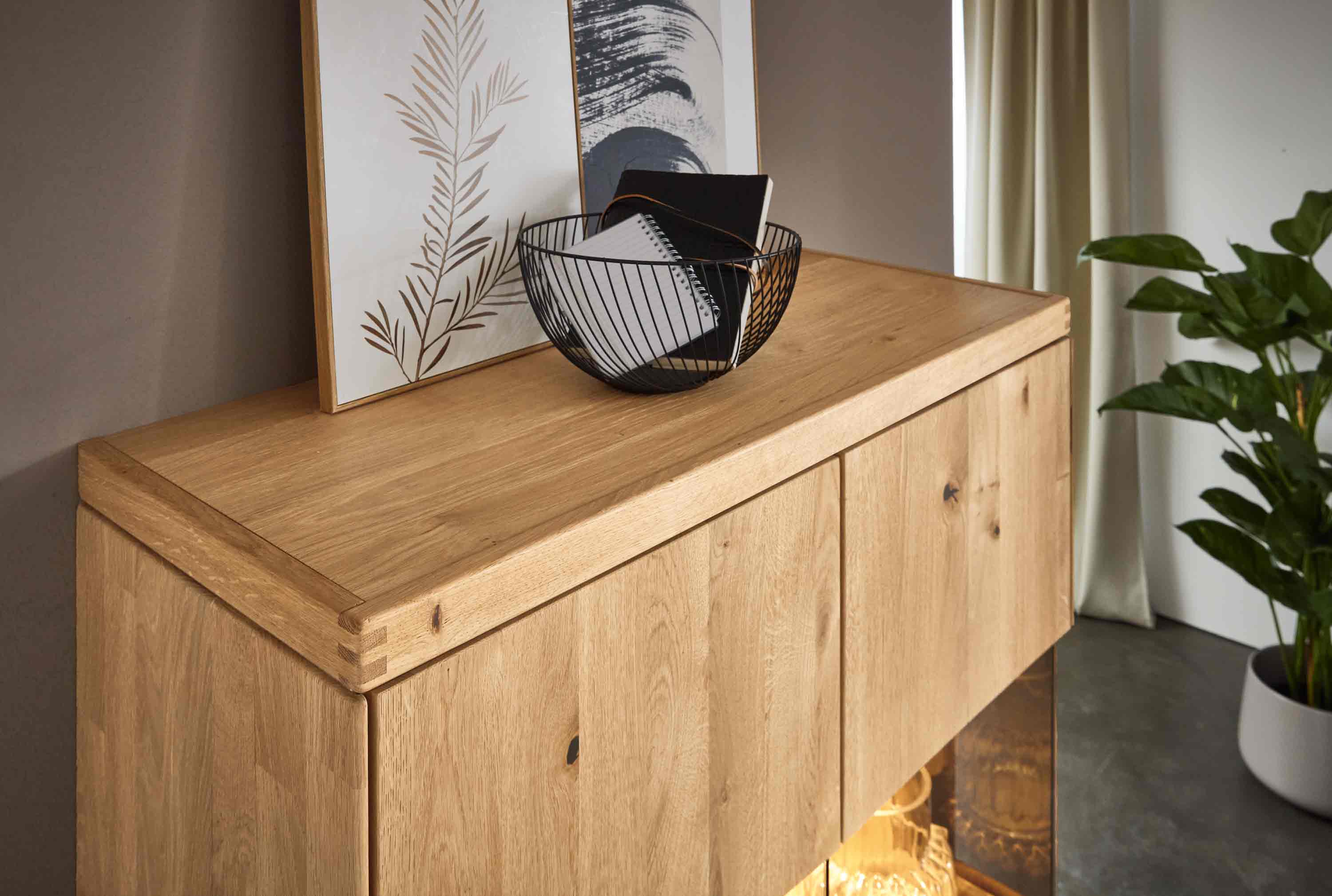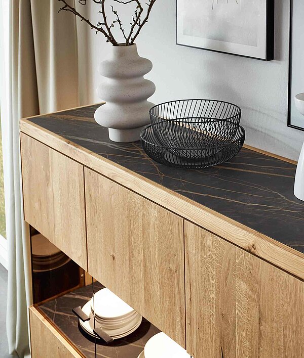 Entdecken Sie unser Massivholzprogramm WM 2520 – eine faszinierende Verbindung aus zwei besonderen Naturmaterialien: Zeitlose, warme Wildeiche mit eleganter, moderner Keramik. Eine klare Linienführung und die hochwertige, handwerkliche Verarbeitung machen diese Möbel zu unaufdringlichen, aber dennoch ausdrucksstarken Schmuckstücken, die sowohl in modernen als auch in klassischen Wohnräumen ihr Zuhause finden können. Die eindrucksvolle Keramik fügt sich mit ihren farblich abgestimmten Adern stilvoll in den zurückhaltend designten Korpus ein und verleiht dem Modell eine frische Anmutung. Feine, optische Verzinkungen an den Abdeckblättern runden das Möbeldesign ab.