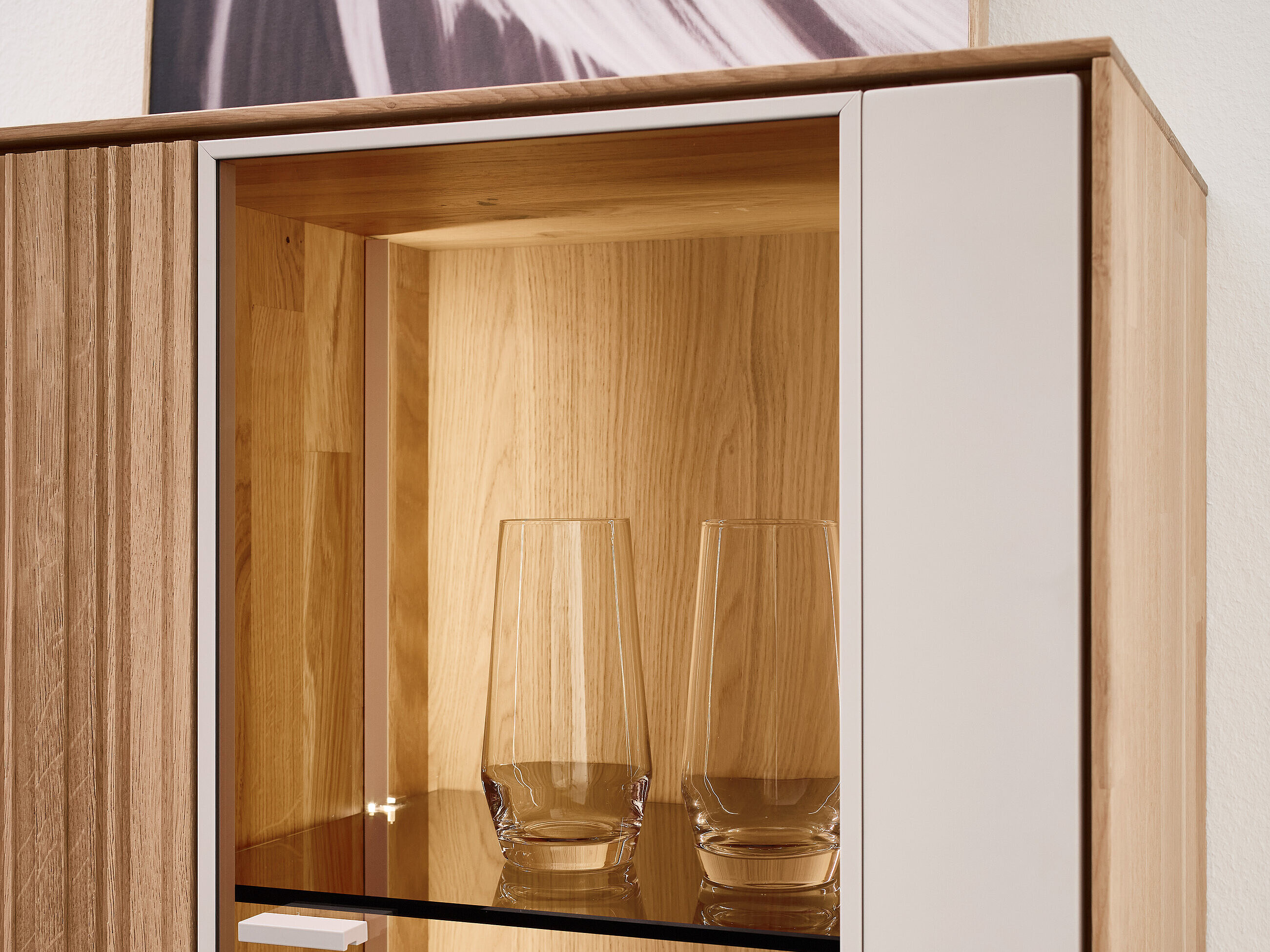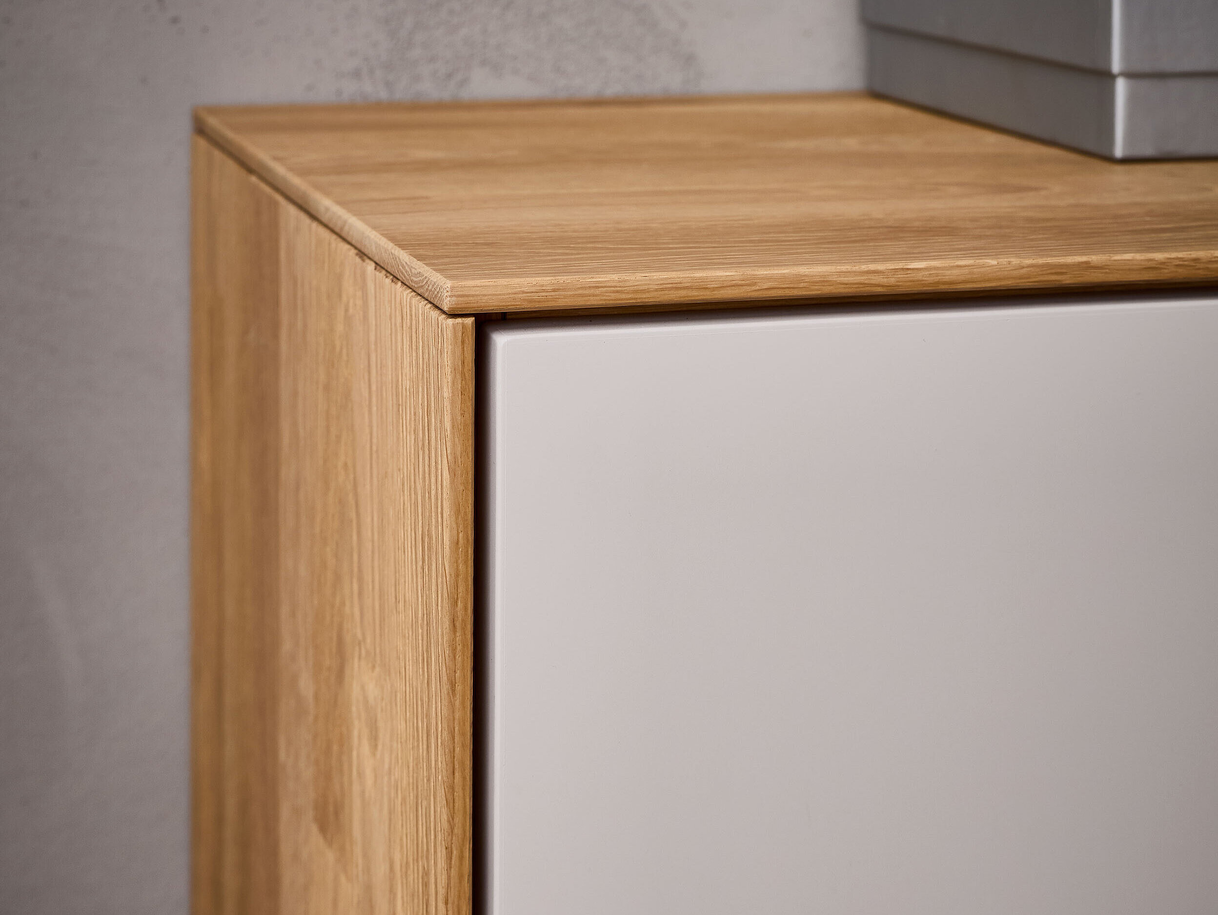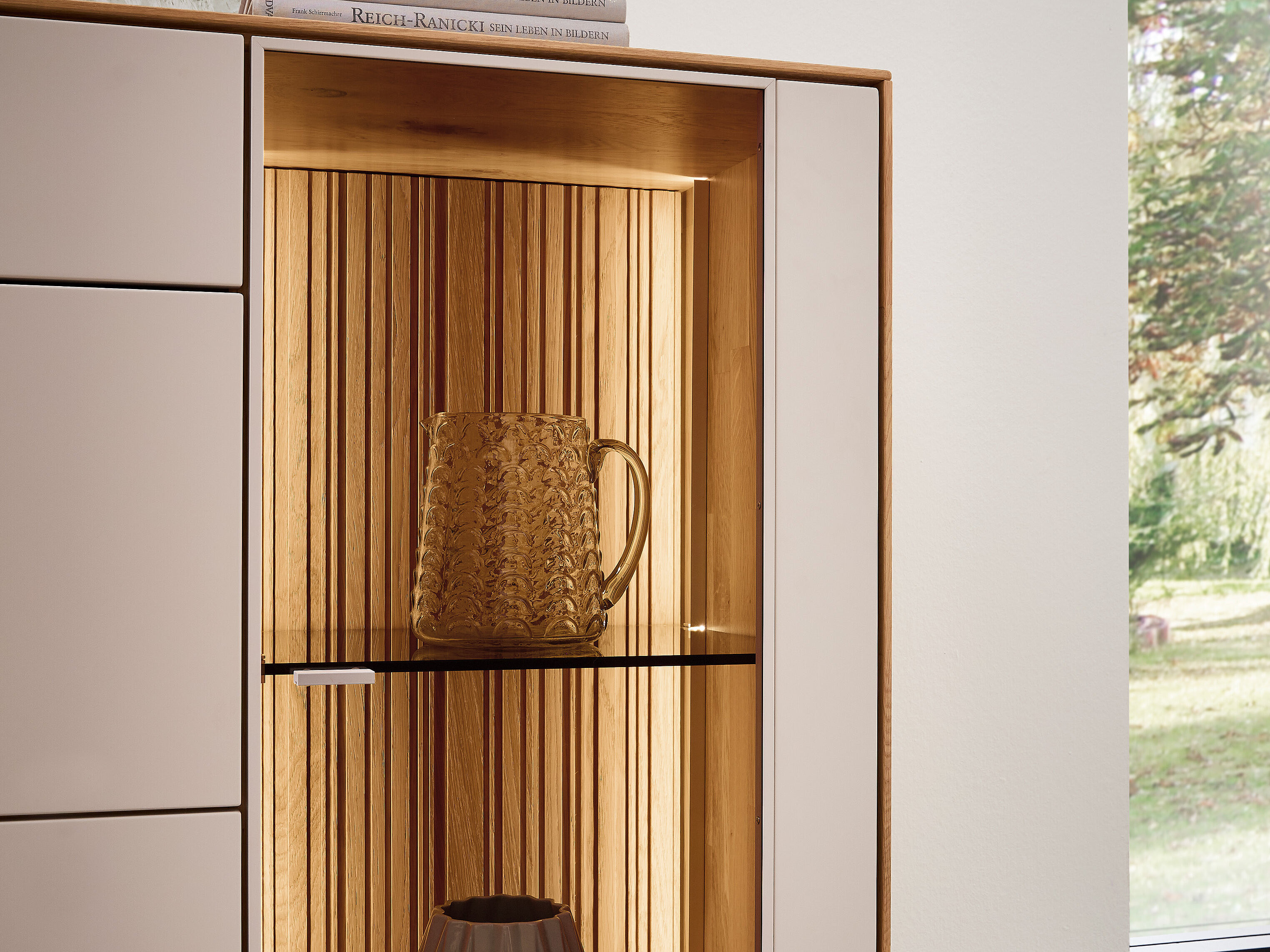 Mit den neuen Einzelmöbel aus der Modellreihe WM 2610 zieht moderne Wohnkultur in Ihr Zuhause ein. Die gelungene Kombination aus hochwertigem Massivholz und eleganten Lackfronten schafft ein harmonisches Gesamtbild, das Natürlichkeit und Design auf besondere Weise vereint. Die sanfte Lackfarbe Perla verleiht den Möbeln eine edle, zeitlose Ausstrahlung und bringt gleichzeitig Leichtigkeit in den Wohnraum. Optional können unsere die Möbel durch filigrane Fußgestelle ergänzt werden. Das natürliche Massivholz sorgt für Wärme, Beständigkeit und eine authentische Wohnatmosphäre, während die sorgfältige Verarbeitung und die hochwertigen Materialien den hohen Qualitätsanspruch dieses Wohnprogramms unterstreichen. Ein Highlight ist der Akzent aus massiver Eiche in 3D-Finline-Struktur: Die fein gearbeitete, dreidimensionale Oberfläche bringt Bewegung und Tiefe ins Design und setzt stilvolle Akzente im Gesamtbild. So entsteht ein modernes, exklusives Wohnmöbel, das Funktionalität und Ästhetik perfekt verbindet.
