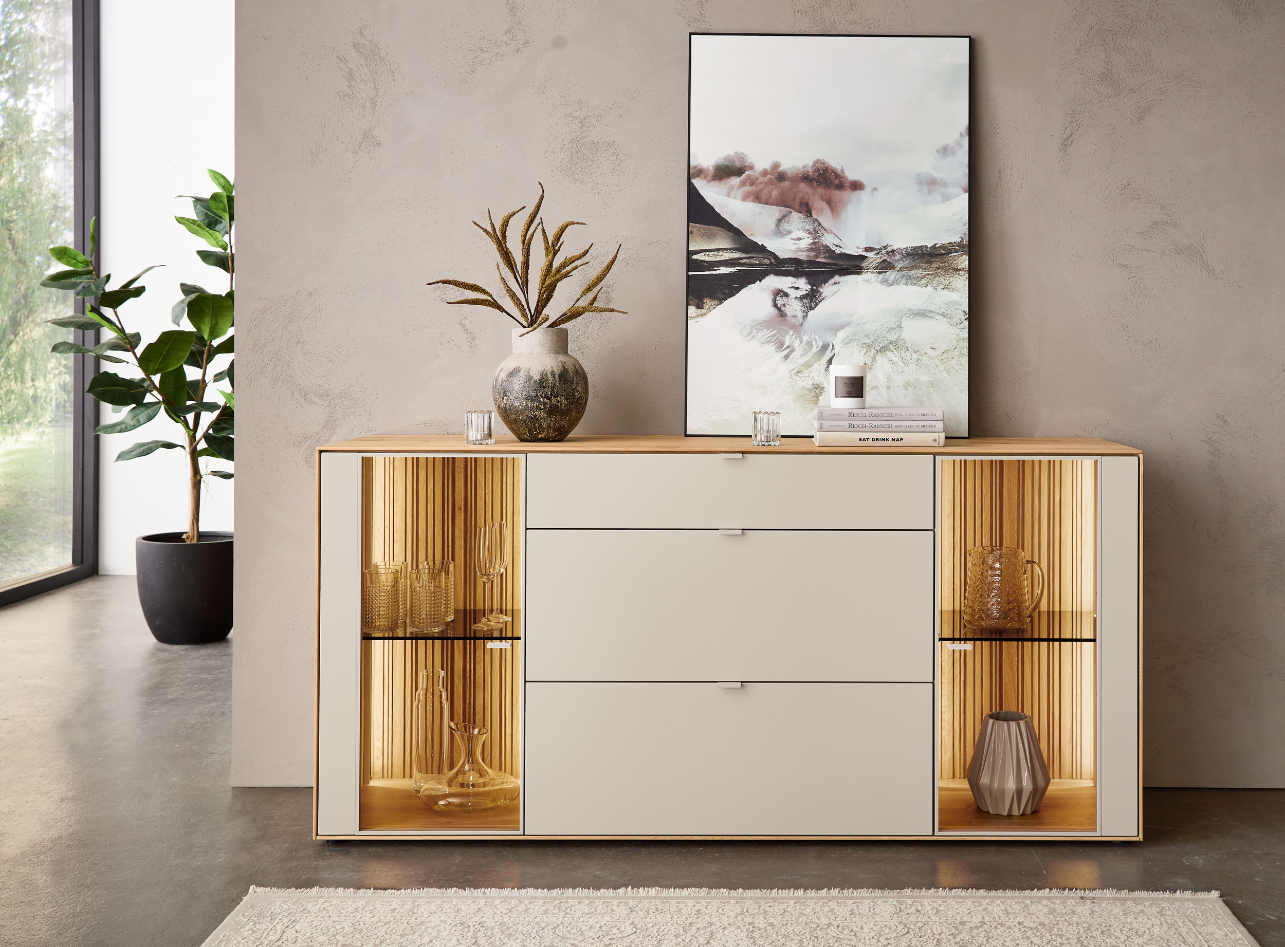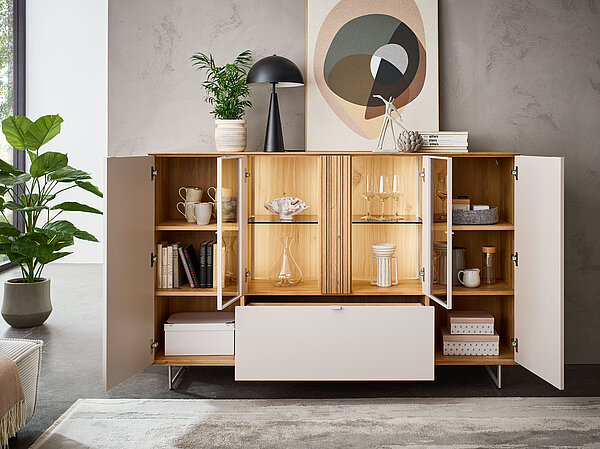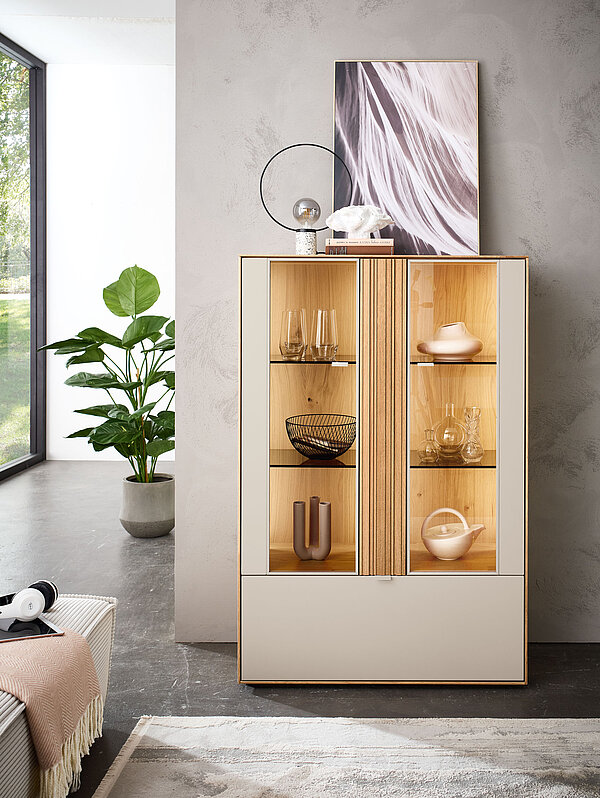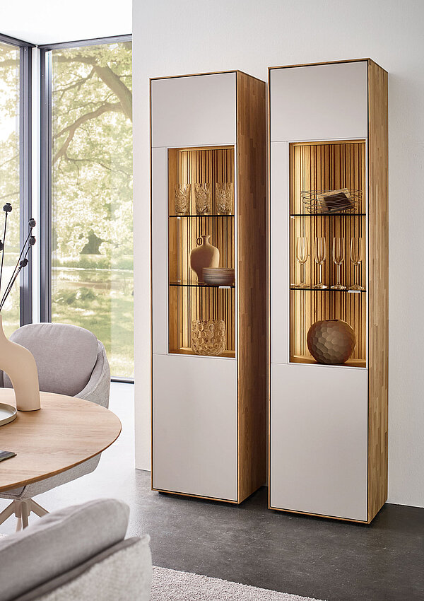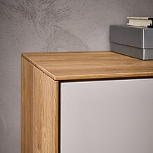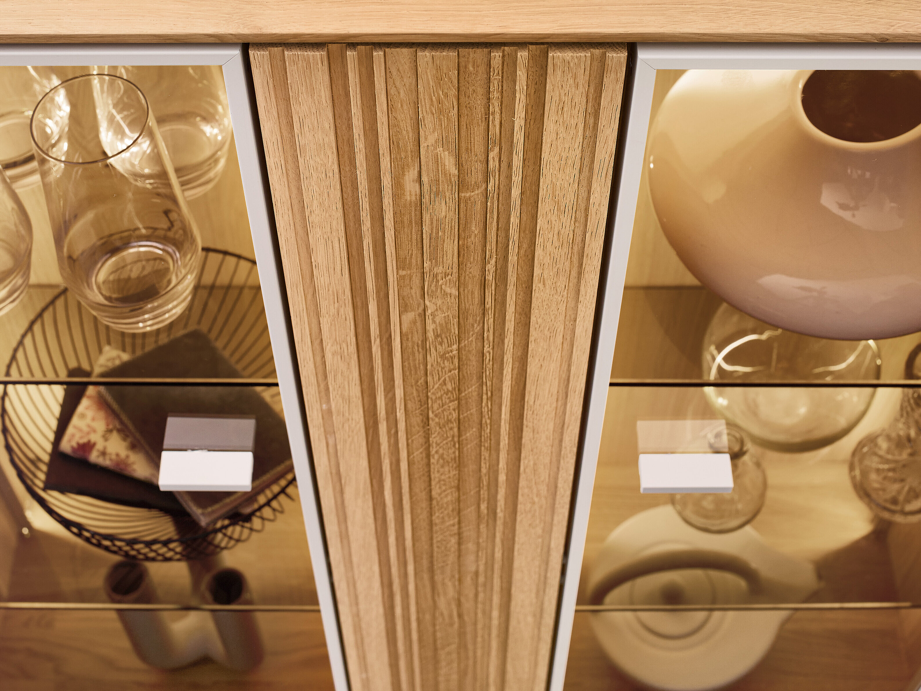 Mit den neuen Einzelmöbel aus der Modellreihe WM 2610 zieht moderne Wohnkultur in Ihr Zuhause ein. Die gelungene Kombination aus hochwertigem Massivholz und eleganten Lackfronten schafft ein harmonisches Gesamtbild, das Natürlichkeit und Design auf besondere Weise vereint. Die sanfte Lackfarbe Perla verleiht den Möbeln eine edle, zeitlose Ausstrahlung und bringt gleichzeitig Leichtigkeit in den Wohnraum. Optional können unsere die Möbel durch filigrane Fußgestelle ergänzt werden. Das natürliche Massivholz sorgt für Wärme, Beständigkeit und eine authentische Wohnatmosphäre, während die sorgfältige Verarbeitung und die hochwertigen Materialien den hohen Qualitätsanspruch dieses Wohnprogramms unterstreichen. Ein Highlight ist der Akzent aus massiver Eiche in 3D-Finline-Struktur: Die fein gearbeitete, dreidimensionale Oberfläche bringt Bewegung und Tiefe ins Design und setzt stilvolle Akzente im Gesamtbild. So entsteht ein modernes, exklusives Wohnmöbel, das Funktionalität und Ästhetik perfekt verbindet.