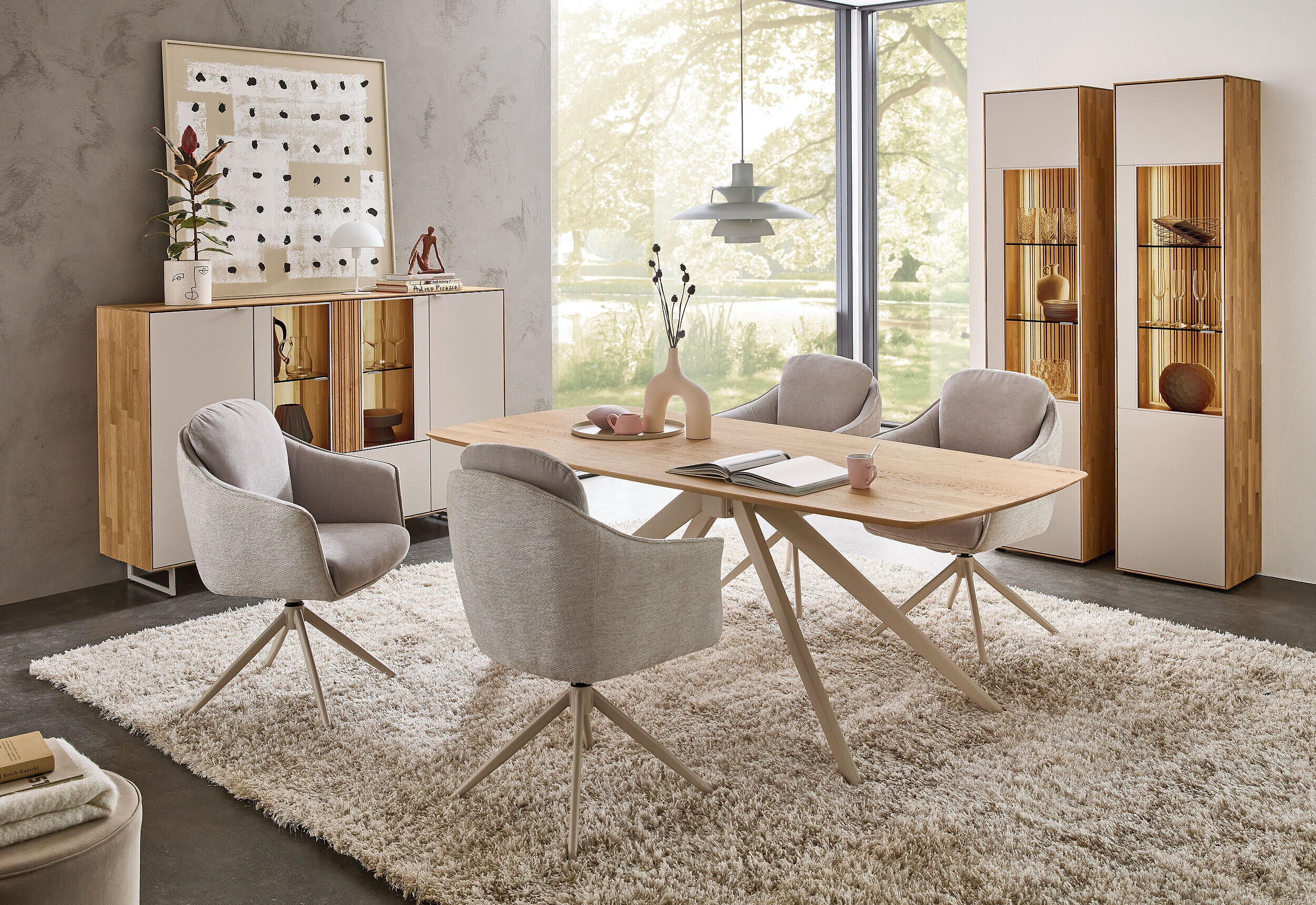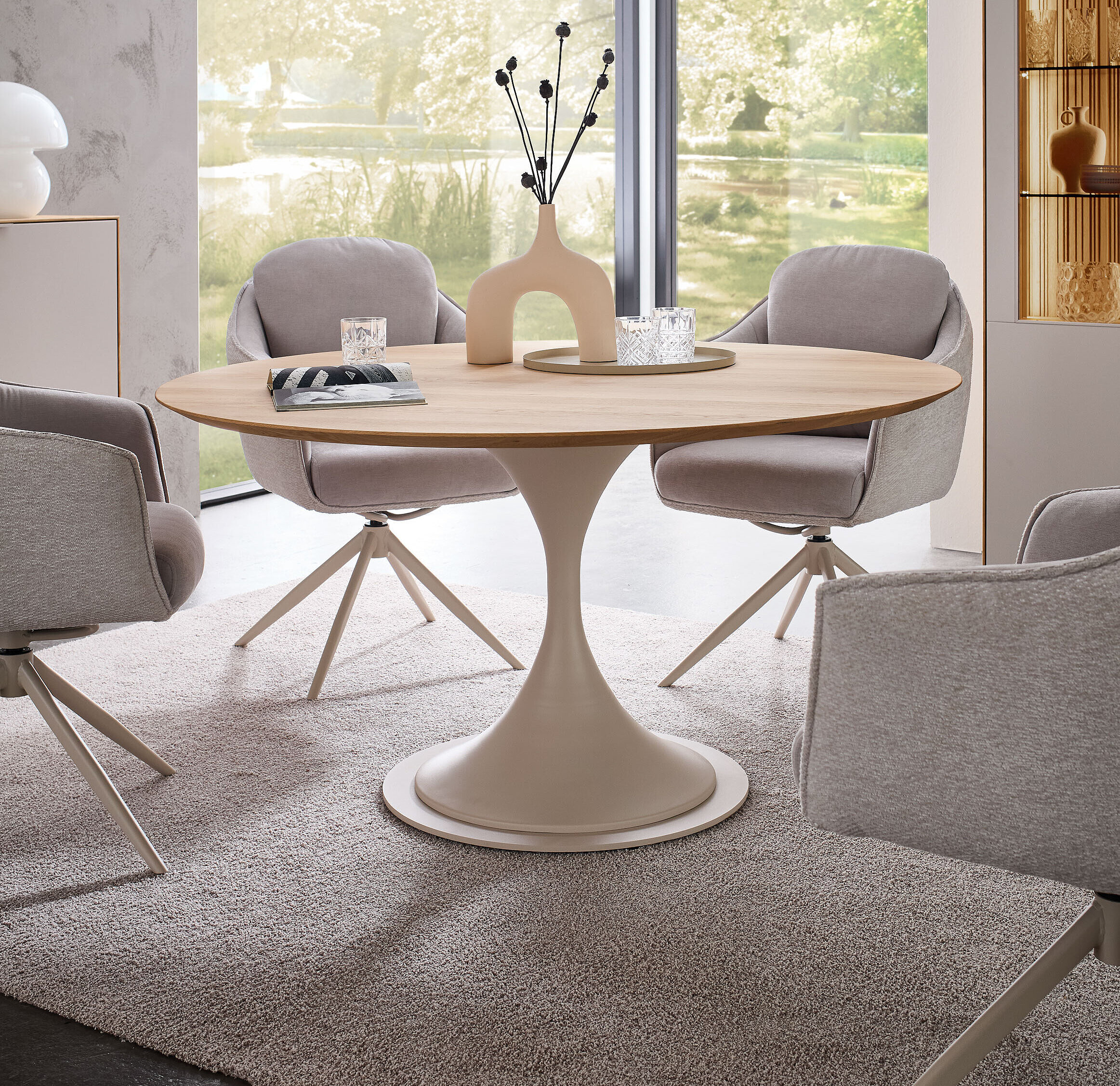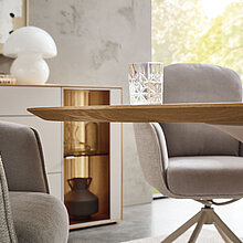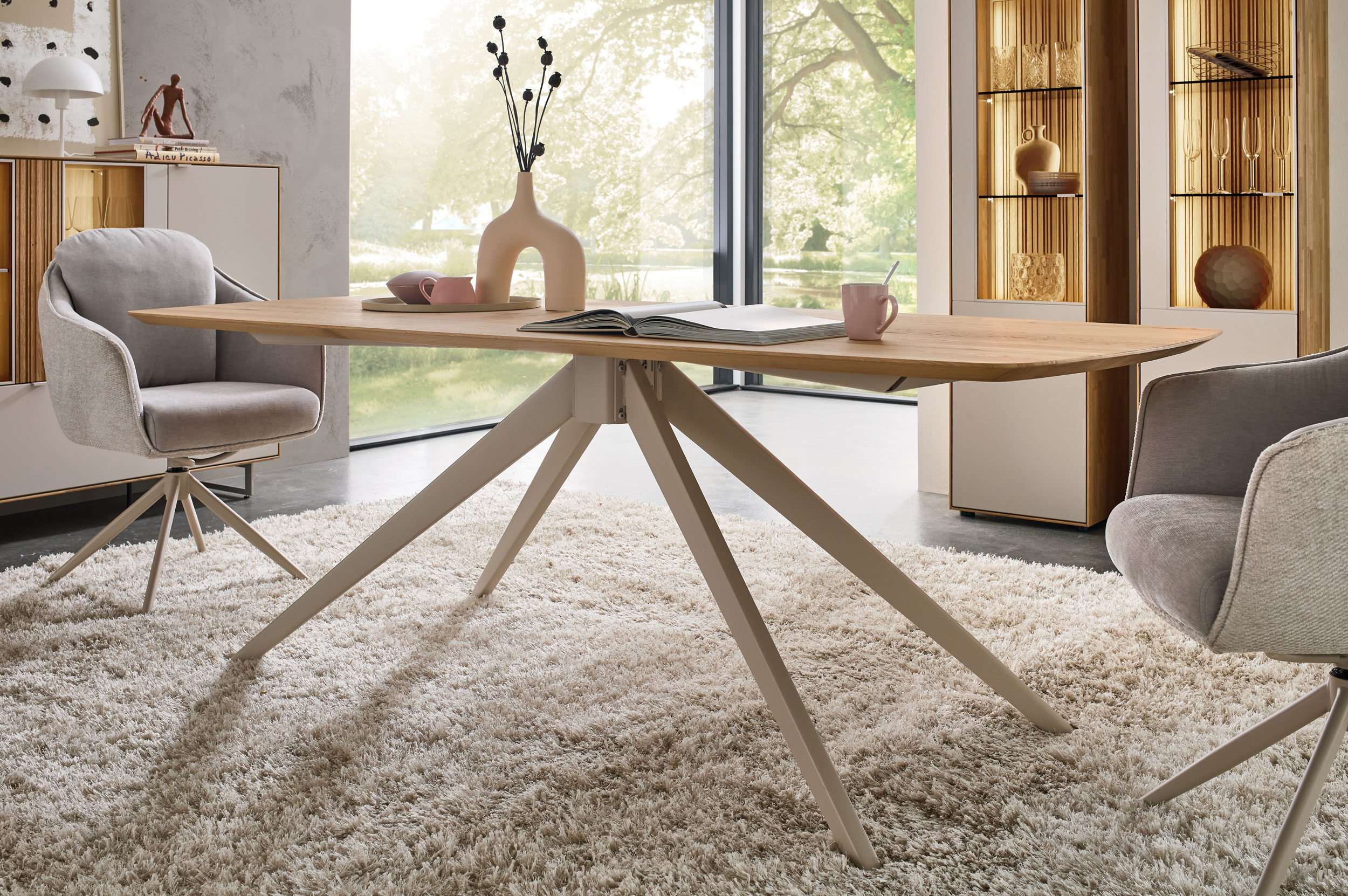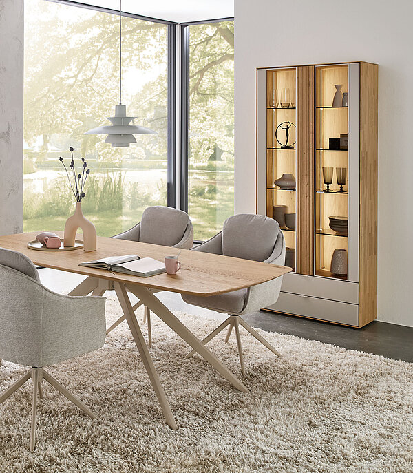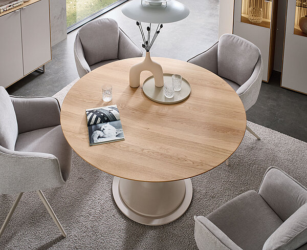 Perfekt zu unserem neuen Wohnprogramm WM 2620 finden Sie hier die passenden Esstische – Charakterstarkes Design in zweifacher Ausführung: Mit seinem eleganten perlafarbigen pulverbeschichteten Gestell vereint dieser Tisch Stabilität mit edler Optik. Er ist mit zwei massiven Tischplattenformen verfügbar – wahlweise im dänisch ovalen Stil mit Schweizer Kante oder als „Calgory“-Variante mit abgerundeten Ecken und softem Profil. Integrierte, höhenjustierbare Kunststoff-Stellfüße schonen Ihren Boden und gleichen Unebenheiten perfekt aus. Ein langlebiges Massivholz-Highlight, ideal für stilvolle Dinner-Partys und gemütliche Abende.
