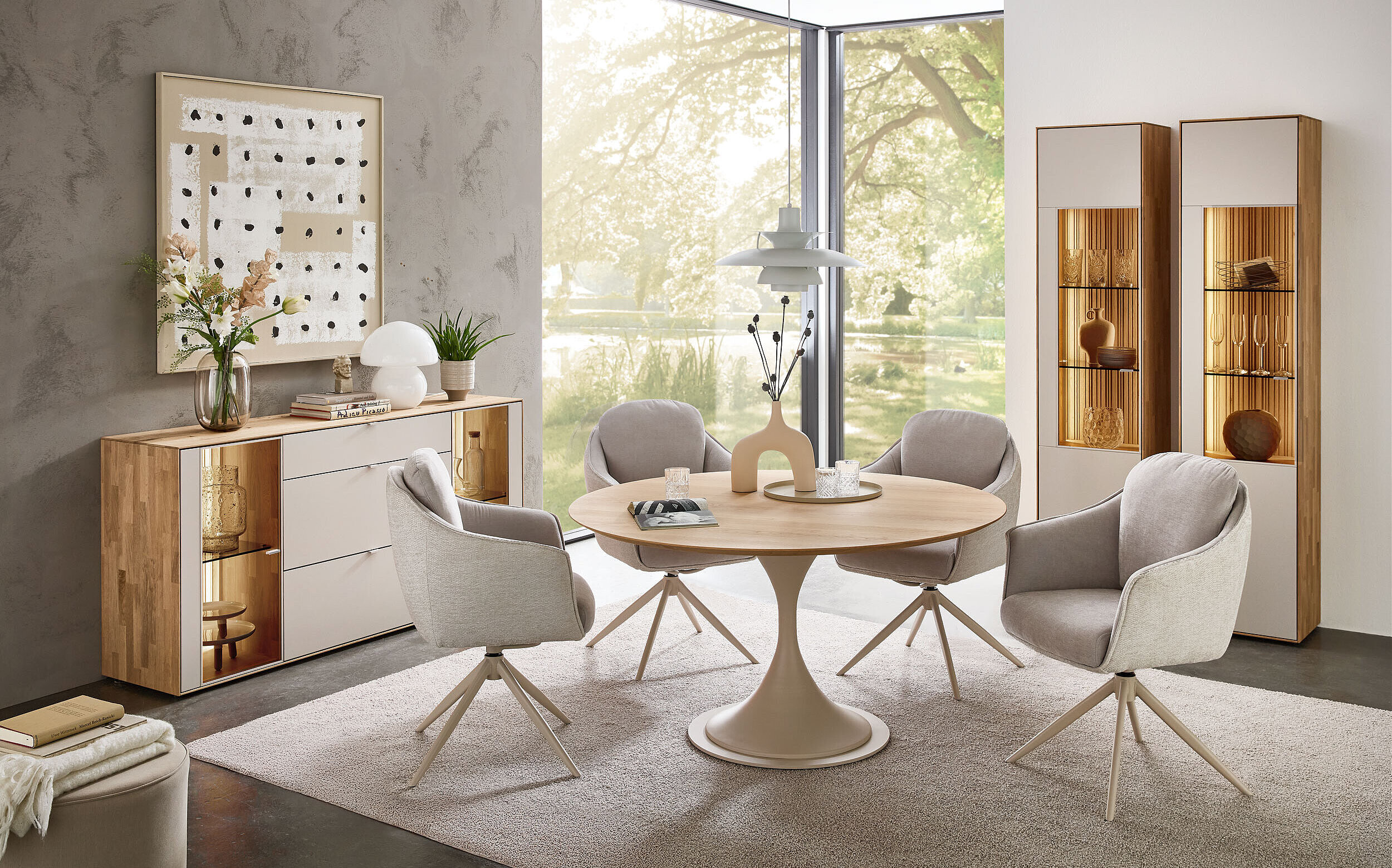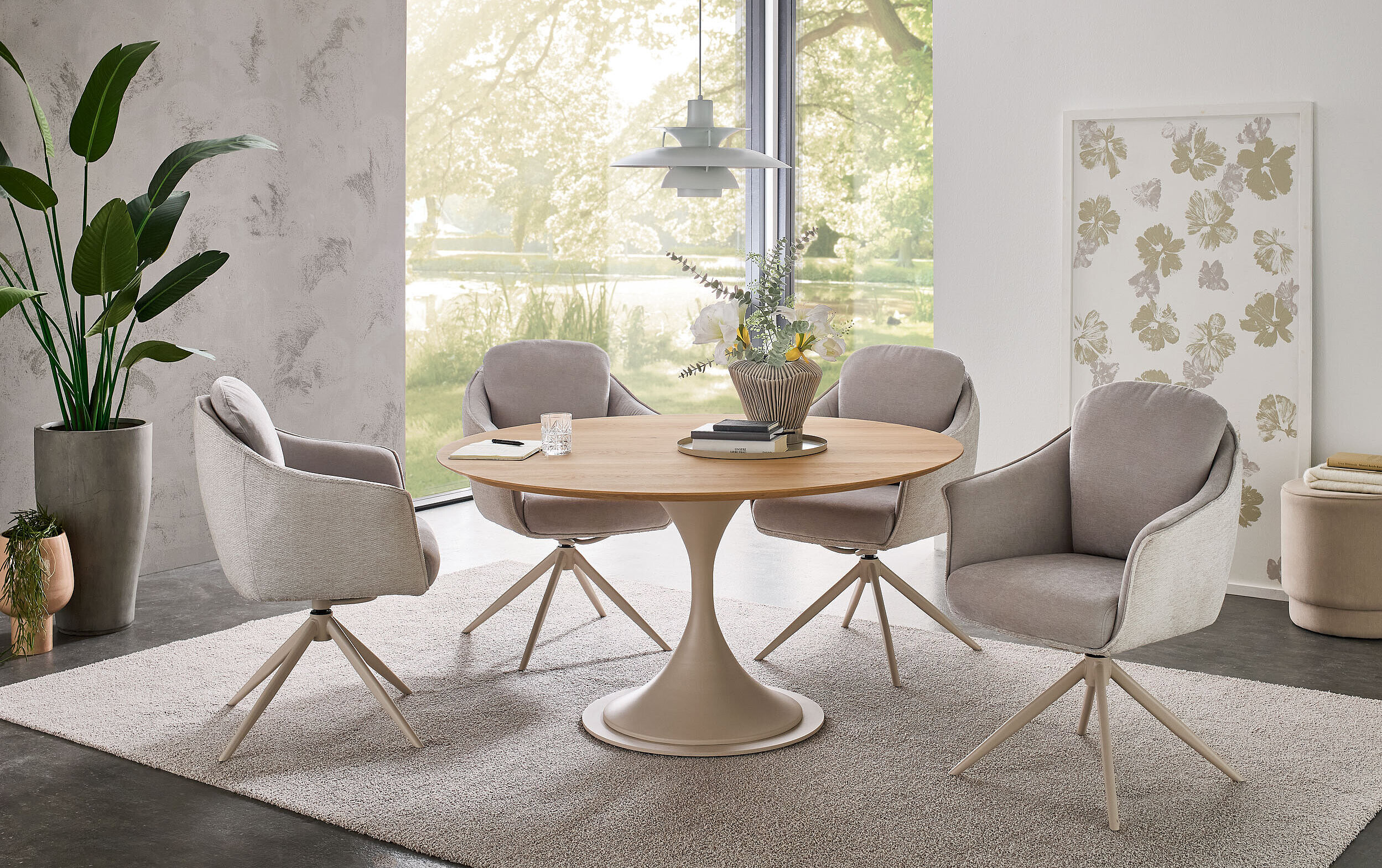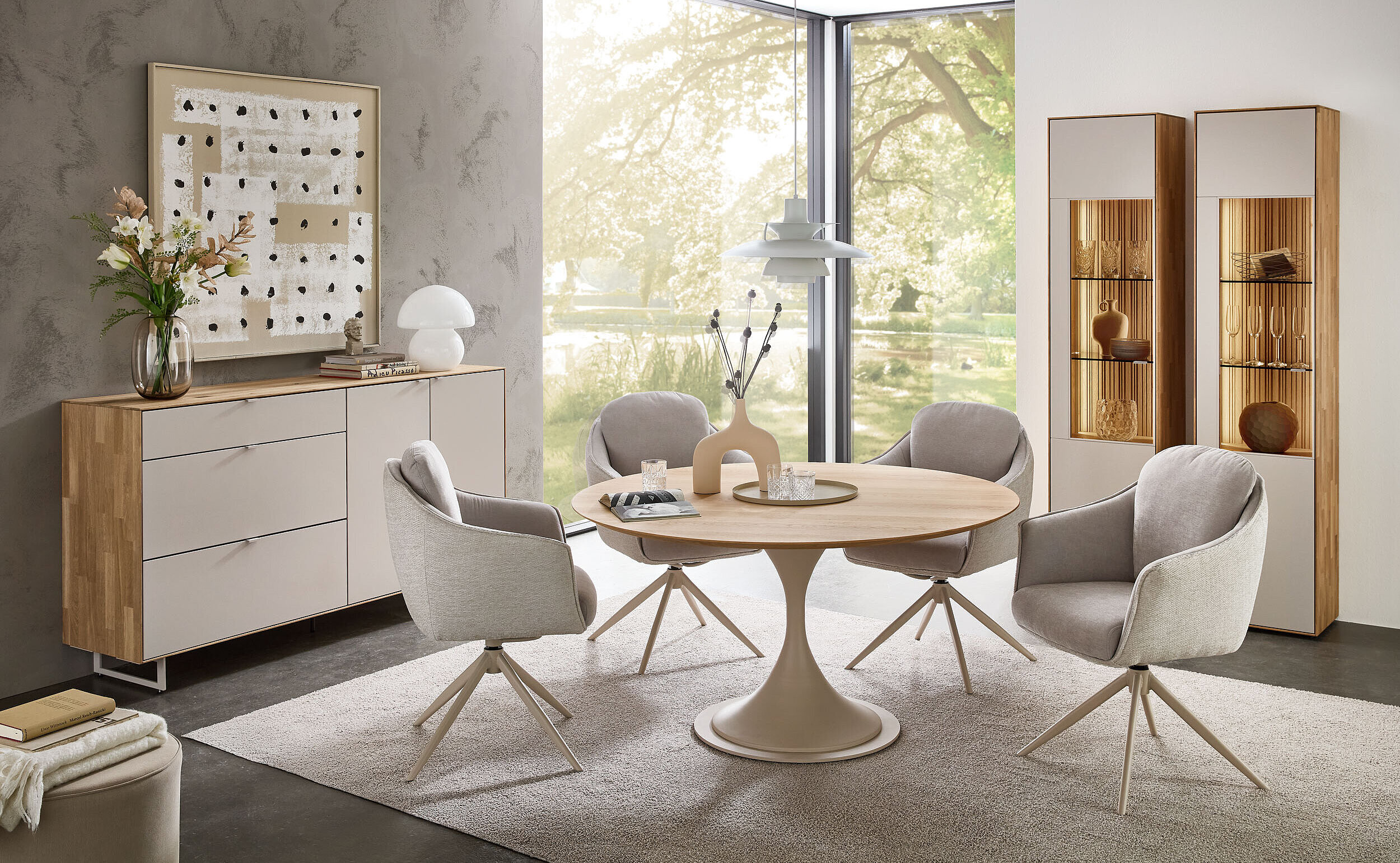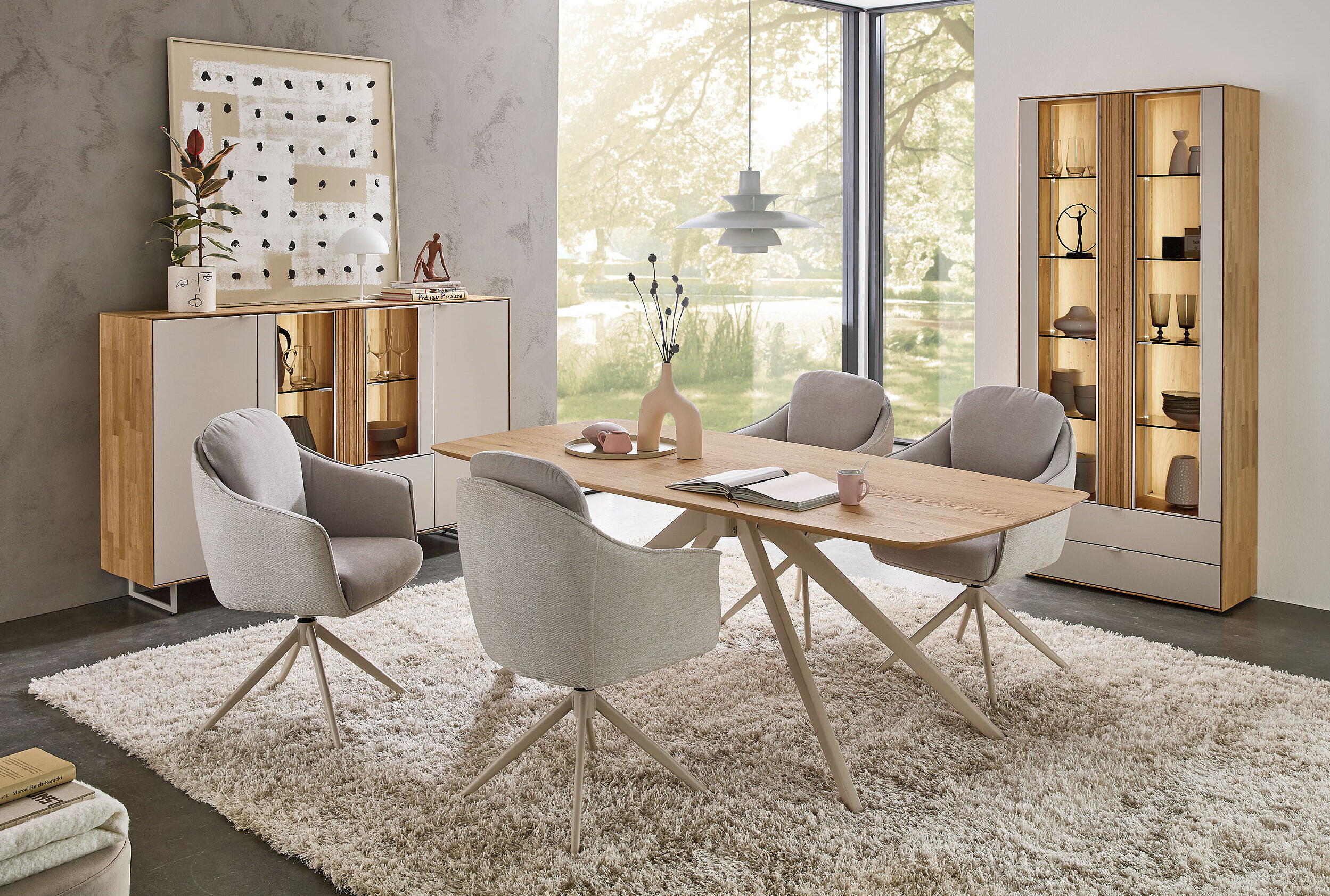 Perfekt zu unserem neuen Wohnprogramm WM 2620 finden Sie hier die passenden Esstische – Charakterstarkes Design in zweifacher Ausführung: Mit seinem eleganten perlafarbigen pulverbeschichteten Gestell vereint dieser Tisch Stabilität mit edler Optik. Er ist mit zwei massiven Tischplattenformen verfügbar – wahlweise im dänisch ovalen Stil mit Schweizer Kante oder als „Calgory“-Variante mit abgerundeten Ecken und softem Profil. Integrierte, höhenjustierbare Kunststoff-Stellfüße schonen Ihren Boden und gleichen Unebenheiten perfekt aus. Ein langlebiges Massivholz-Highlight, ideal für stilvolle Dinner-Partys und gemütliche Abende.