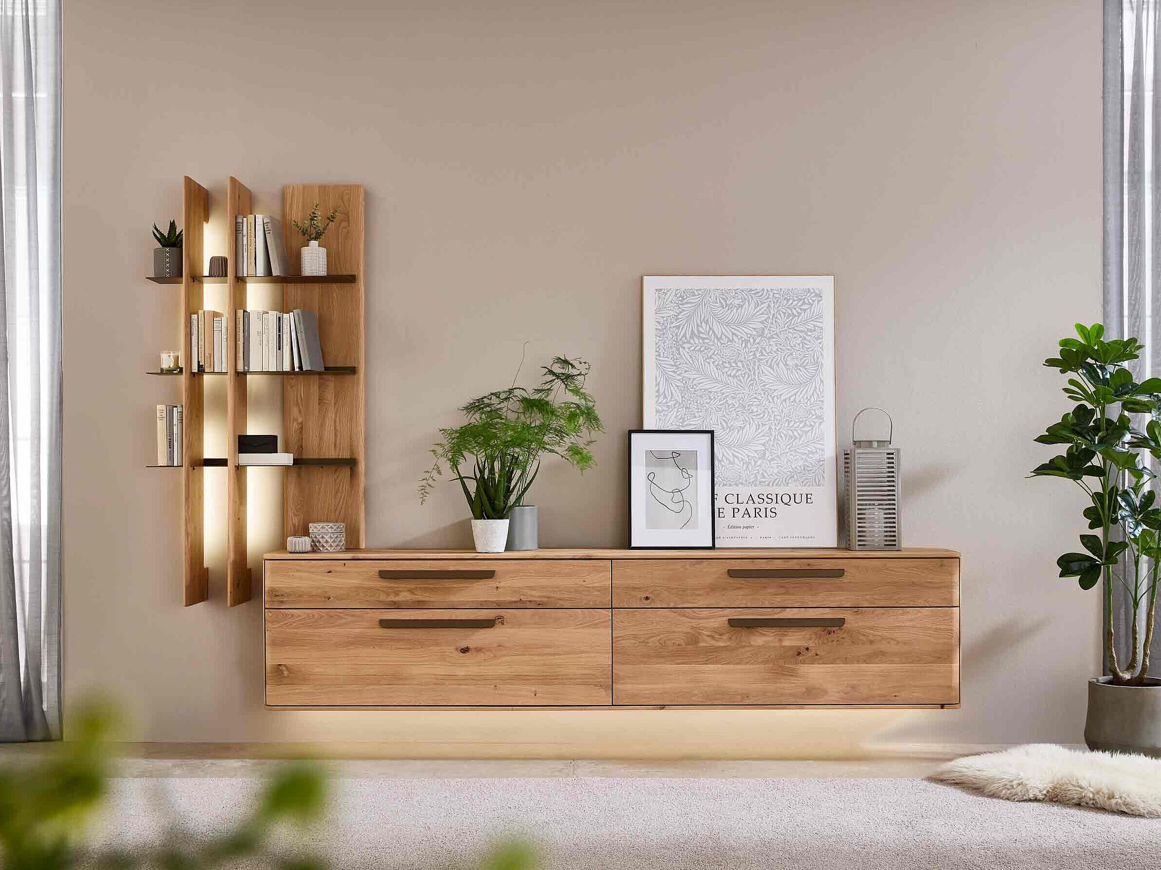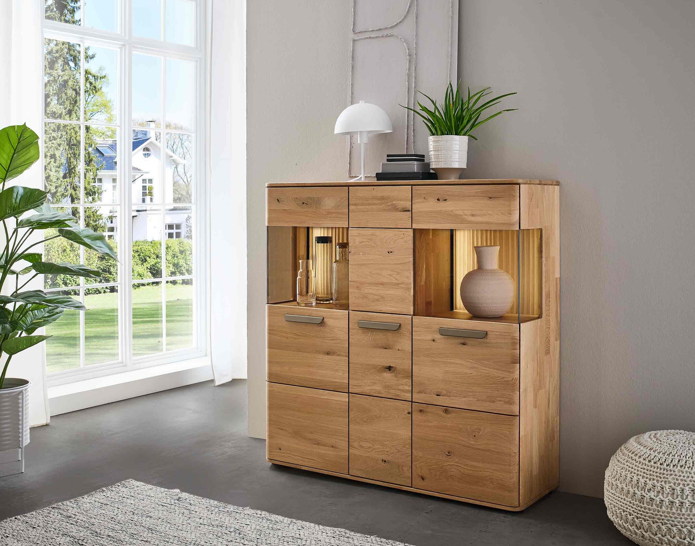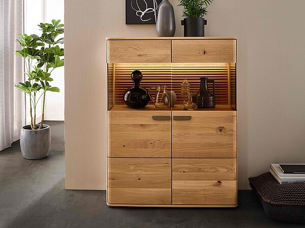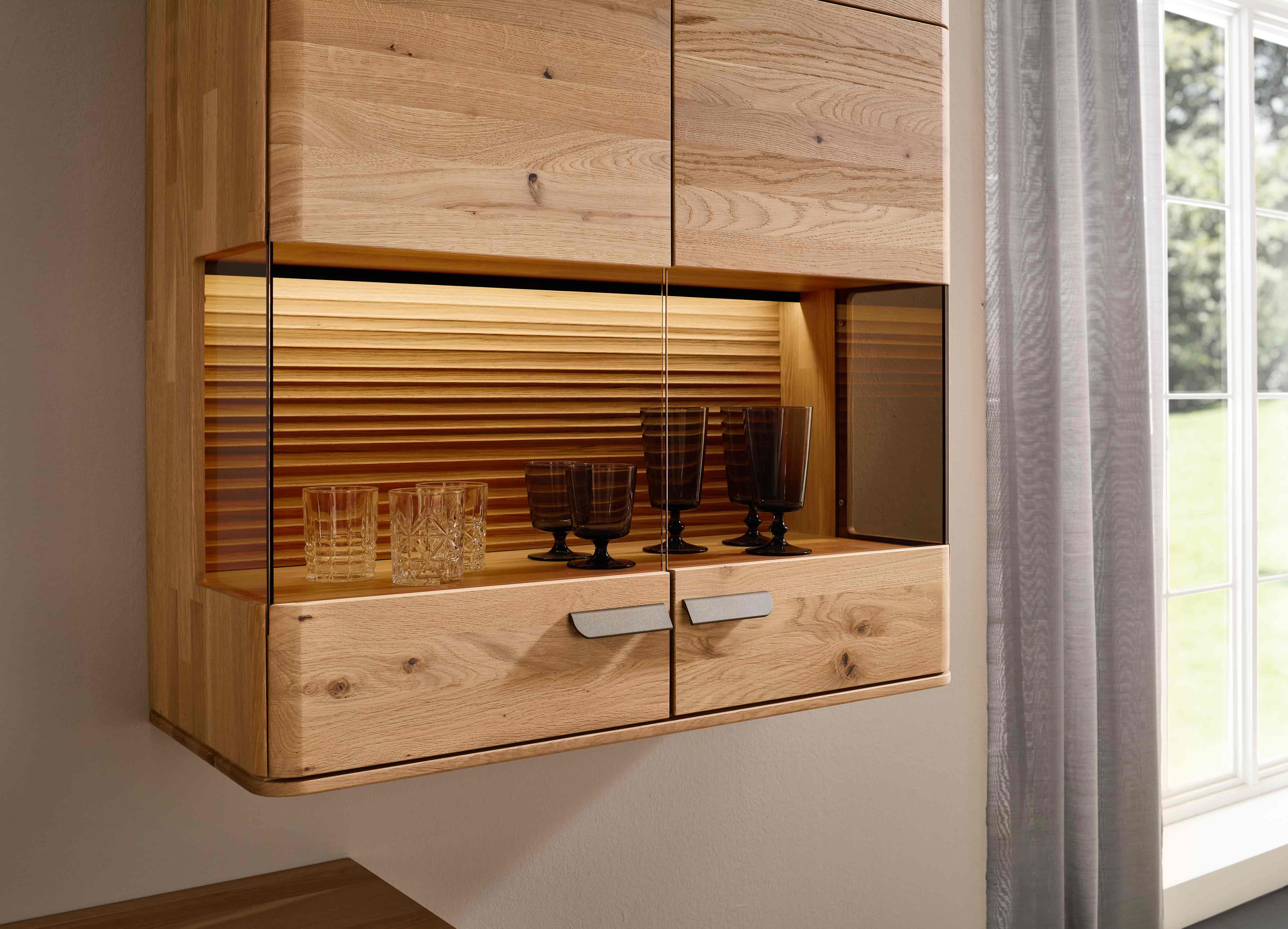 Dieses Einzelmöbel überzeugt durch gemütliches, langlebiges Design und hochwertige Verarbeitung. Soft abgerundete Korpusprofile und weiche Linien verleihen dem Massivholz eine leichte, wohnliche Ausstrahlung. Optional setzt die Rückwand in Wellenoptik „Wildeiche Flow“ einen besonderen Akzent. In Kombination mit der optionalen LED-Beleuchtung entsteht eine warme, stimmungsvolle Atmosphäre, die das Möbel stilvoll in Szene setzt.