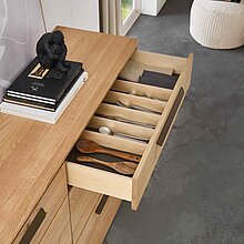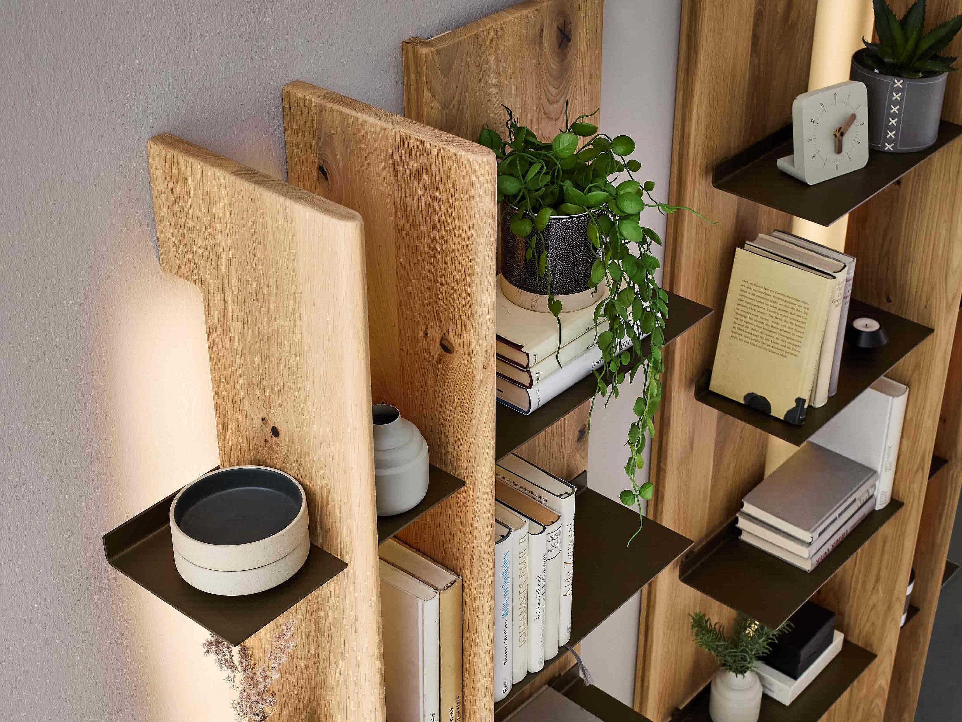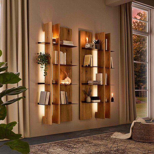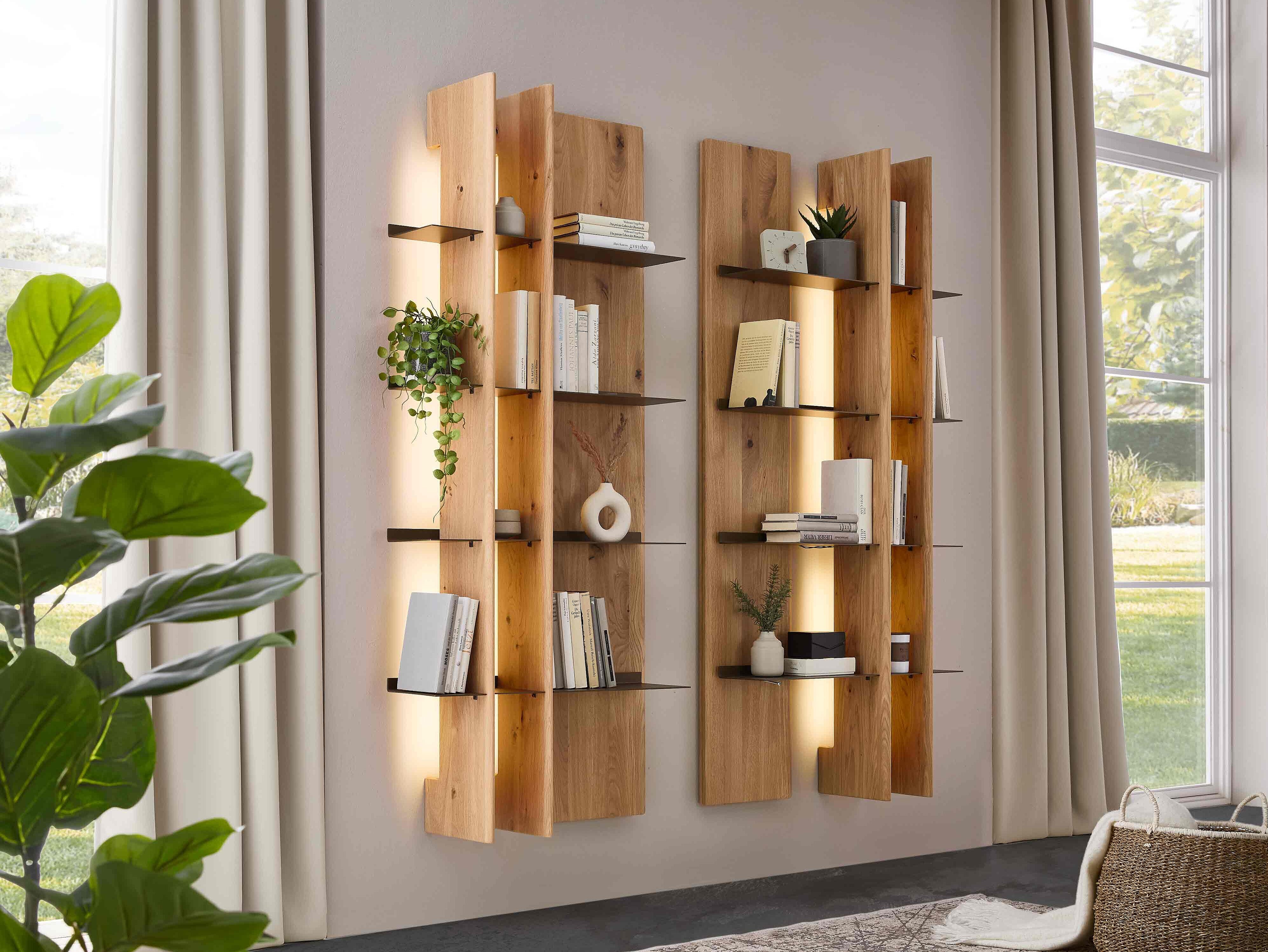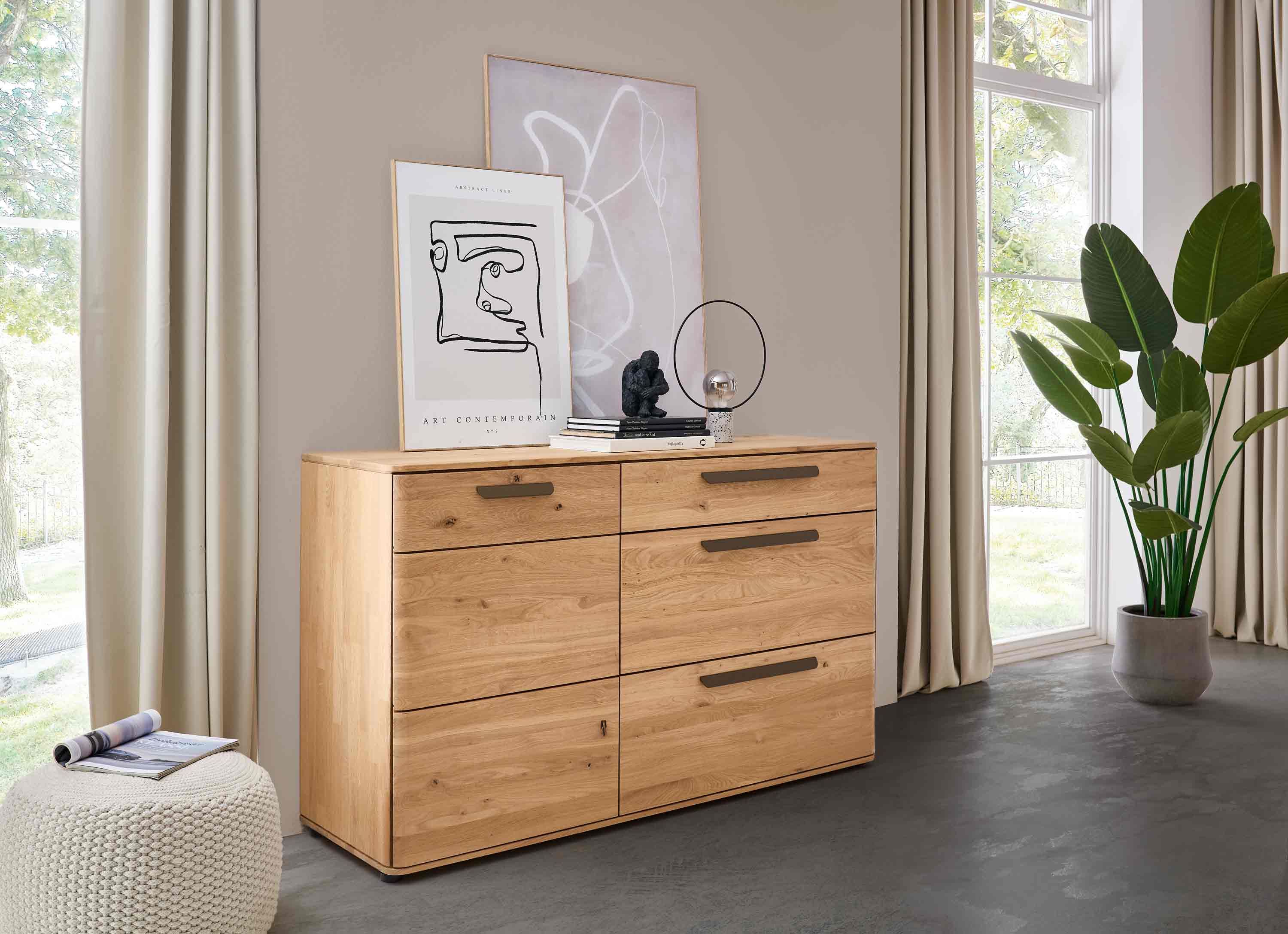Dieses Einzelmöbel überzeugt durch gemütliches, langlebiges Design und hochwertige Verarbeitung. Soft abgerundete Korpusprofile und weiche Linien verleihen dem Massivholz eine leichte, wohnliche Ausstrahlung. Optional setzt die Rückwand in Wellenoptik „Wildeiche Flow“ einen besonderen Akzent. In Kombination mit der optionalen LED-Beleuchtung entsteht eine warme, stimmungsvolle Atmosphäre, die das Möbel stilvoll in Szene setzt.