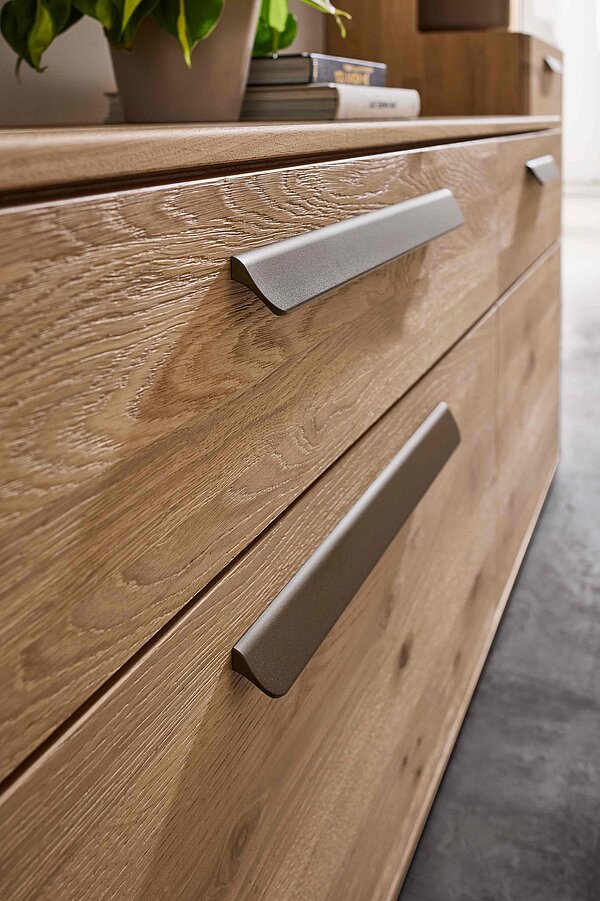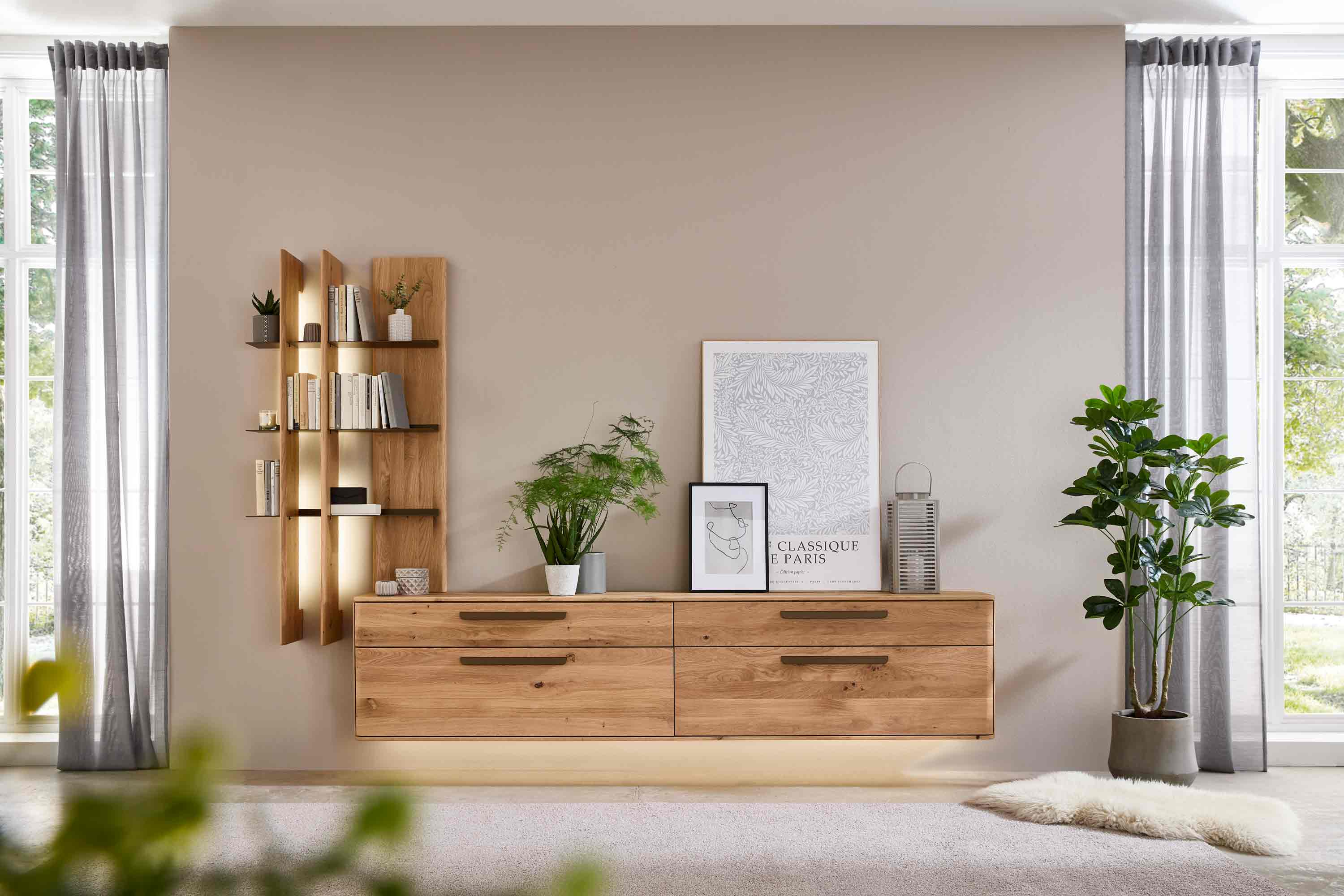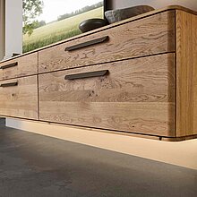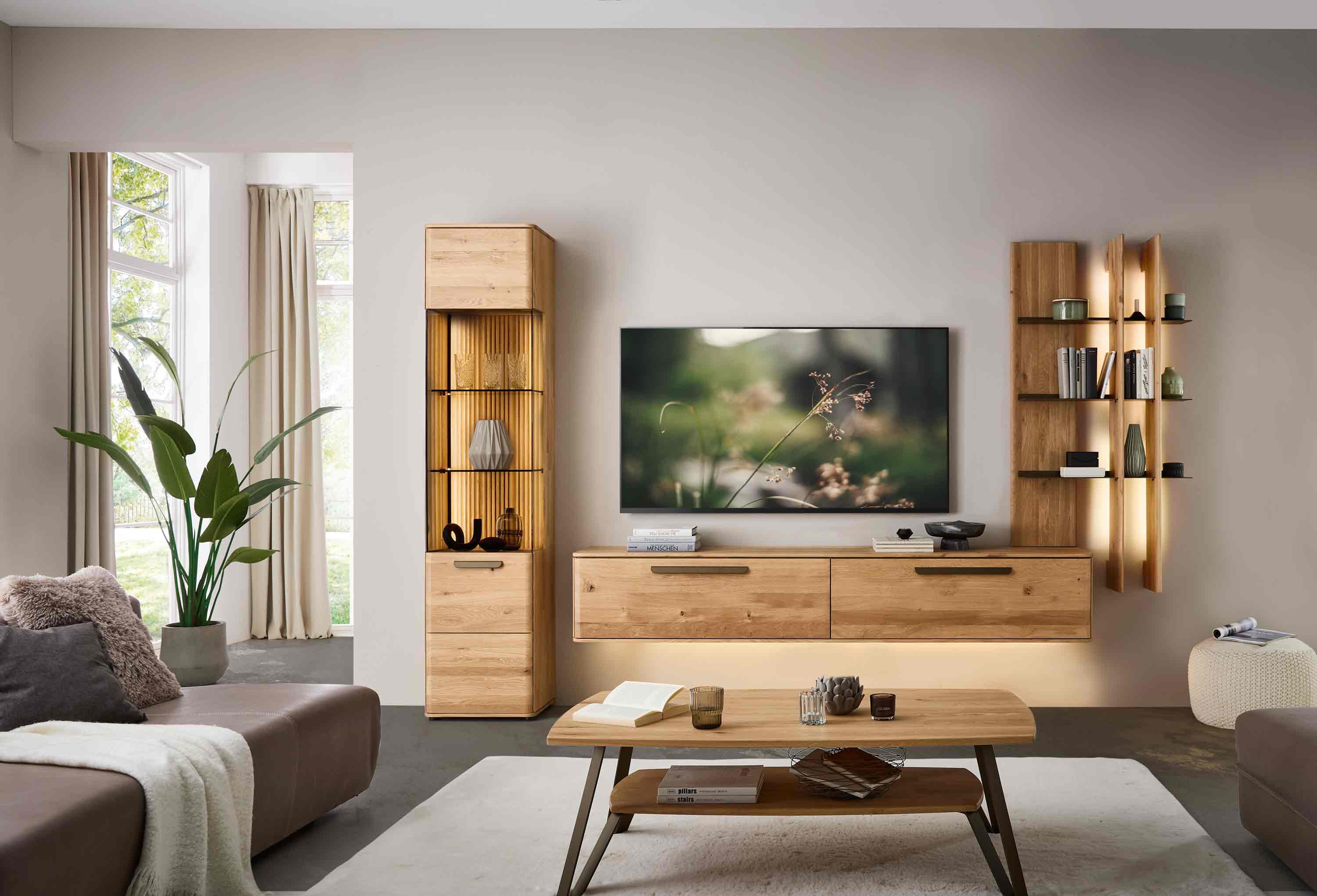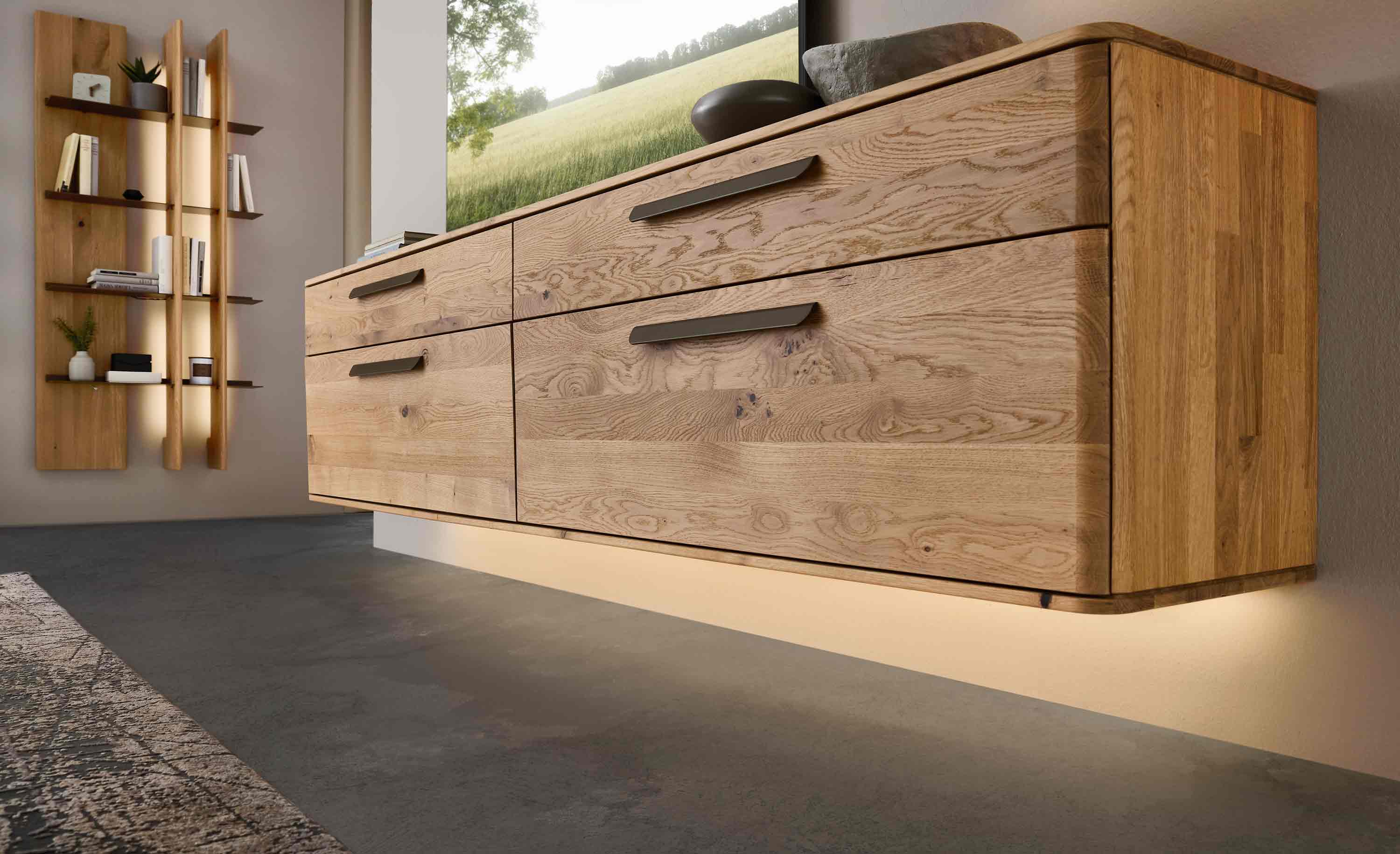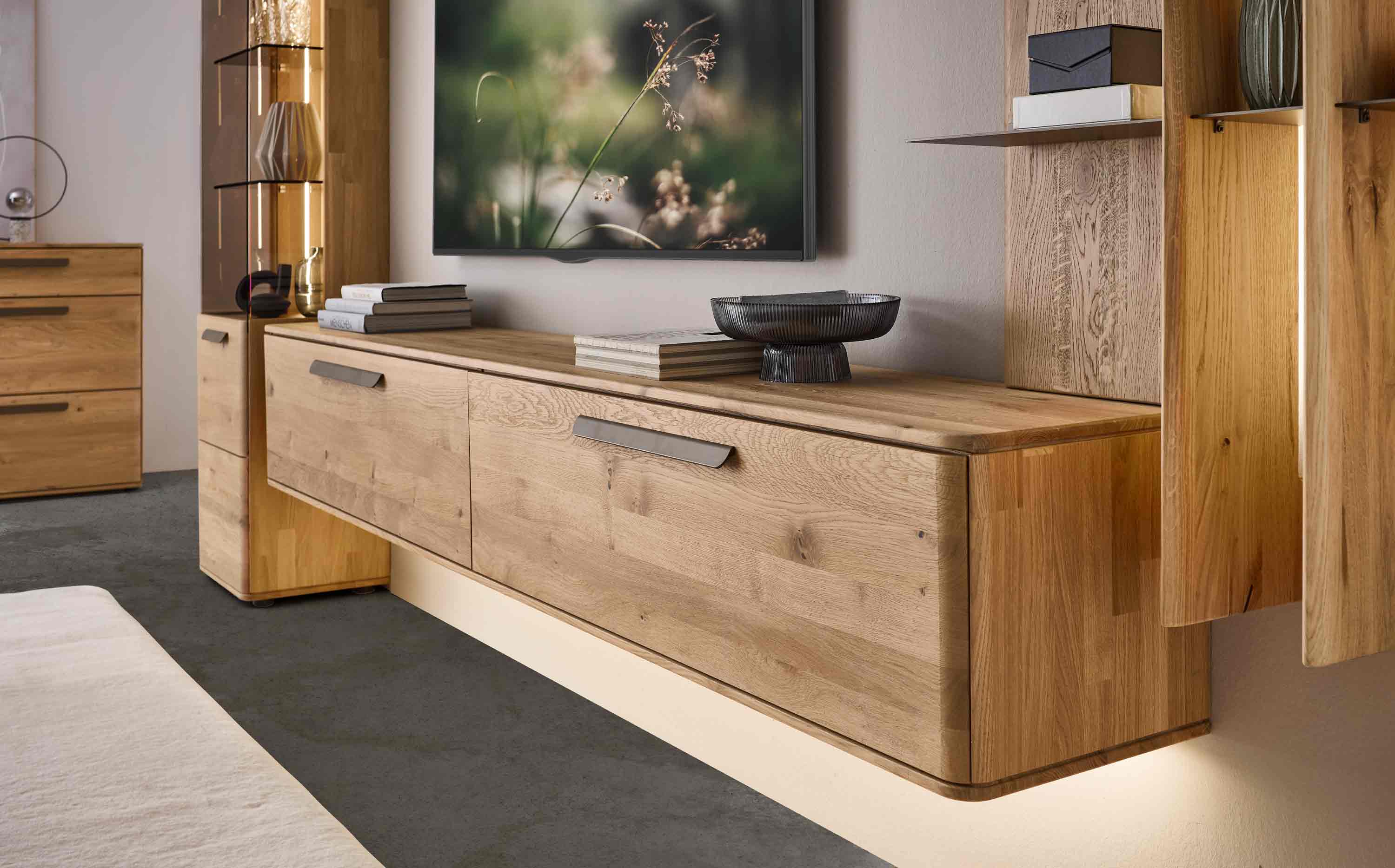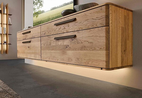 Sichtbare Qualität, spürbare Wertigkeit und ein harmonisches Wohngefühl prägen die eleganten TV-Lowboards aus massiver Wildeiche. Charakteristisch sind die soft abgerundeten Korpusprofilierungen, die für eine ruhige, wohnliche Anmutung sorgen und dem Massivholz eine besondere Leichtigkeit verleihen. Die weichen Linien wirken einladend und wohnlich. Durch die optionalen LED-Beleuchtung entsteht ein stimmungsvolles Lichtspiel, das ihre Lieblingsstücke in Szene setzt und ihrem Wohnzimmer eine warme, gemütliche Atmosphäre verleiht. Ein hochwertiges Massivholzmöbel, das durch Ausstrahlung, Qualität und Beständigkeit überzeugt.