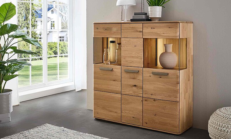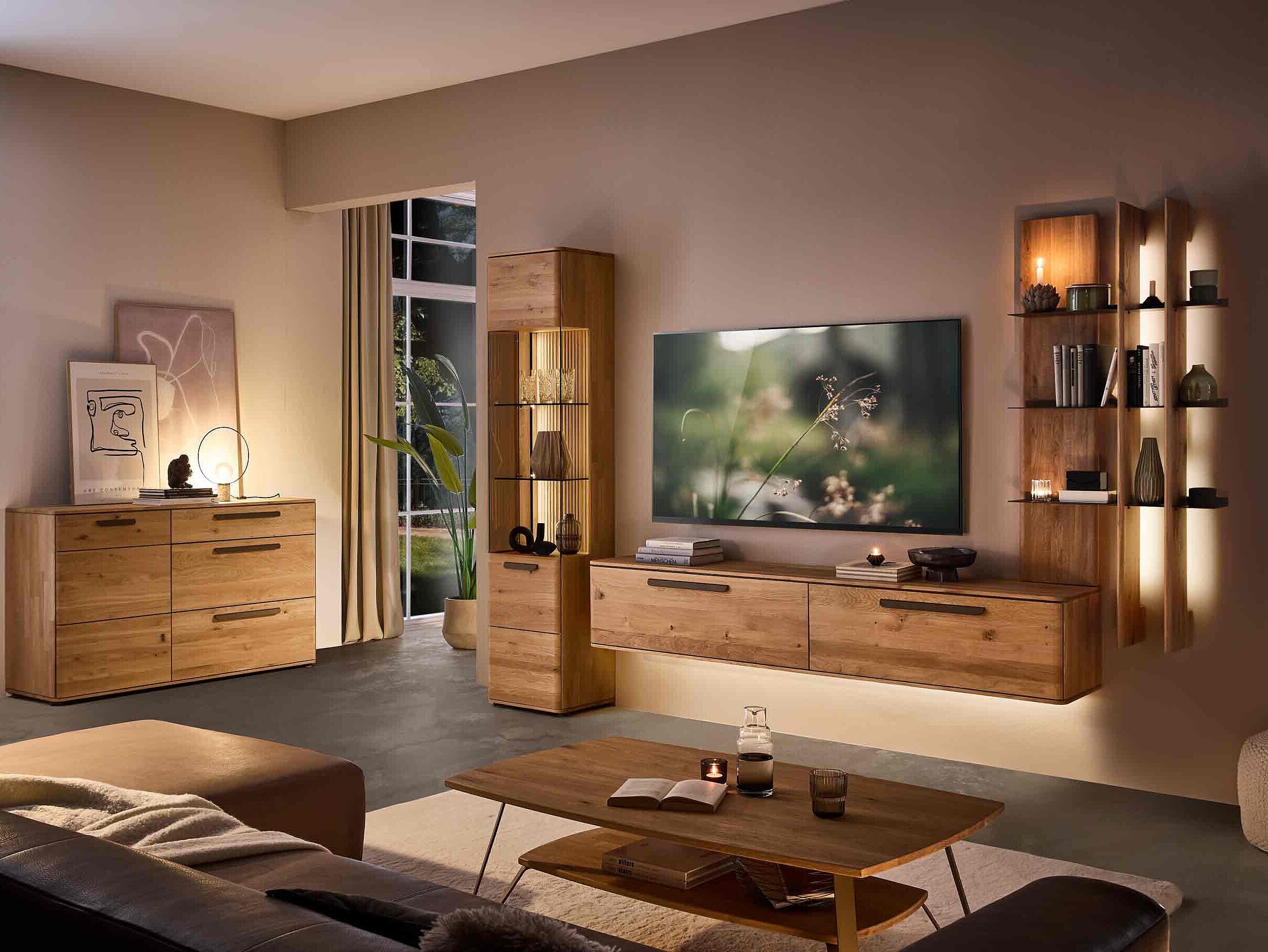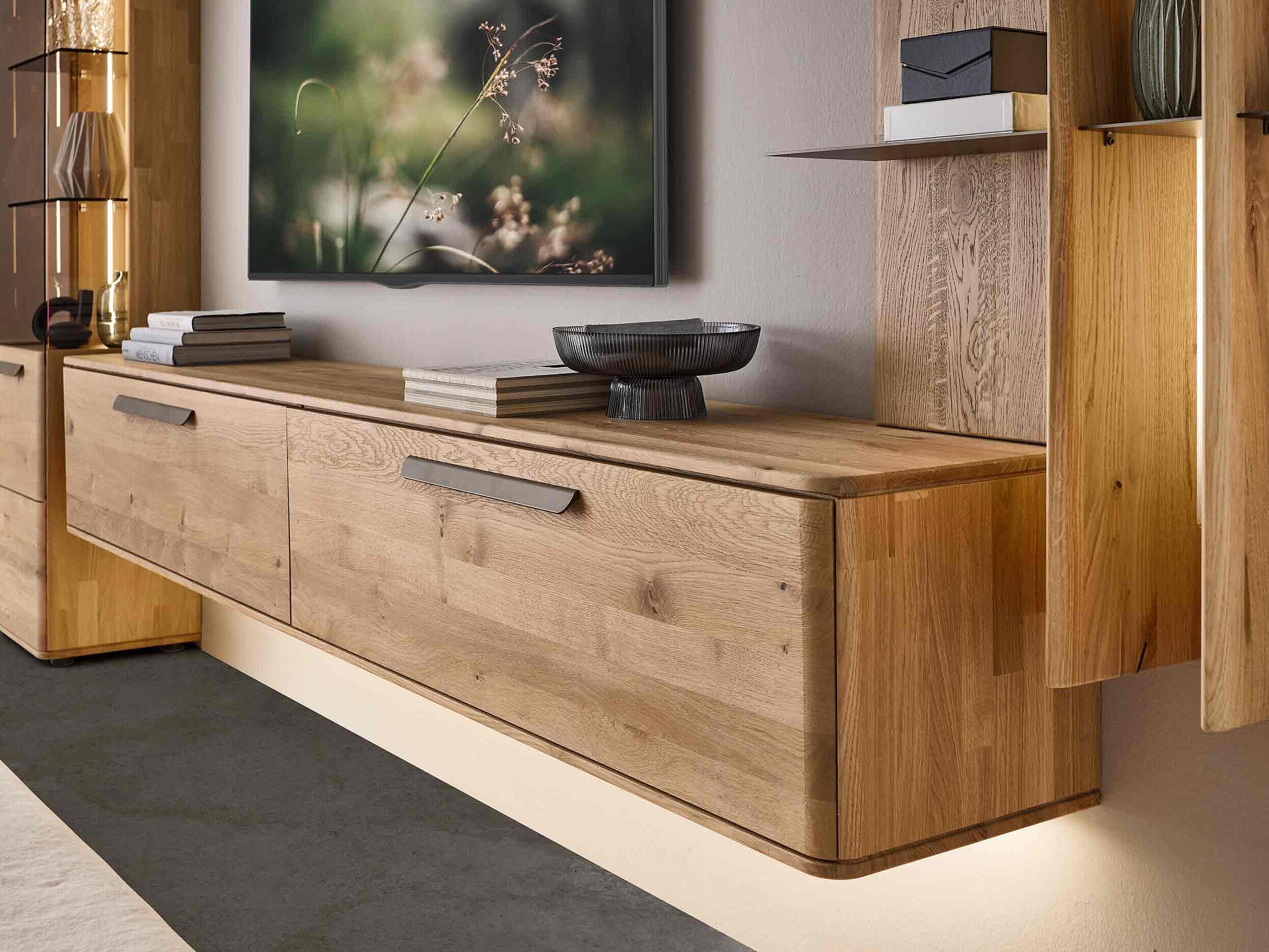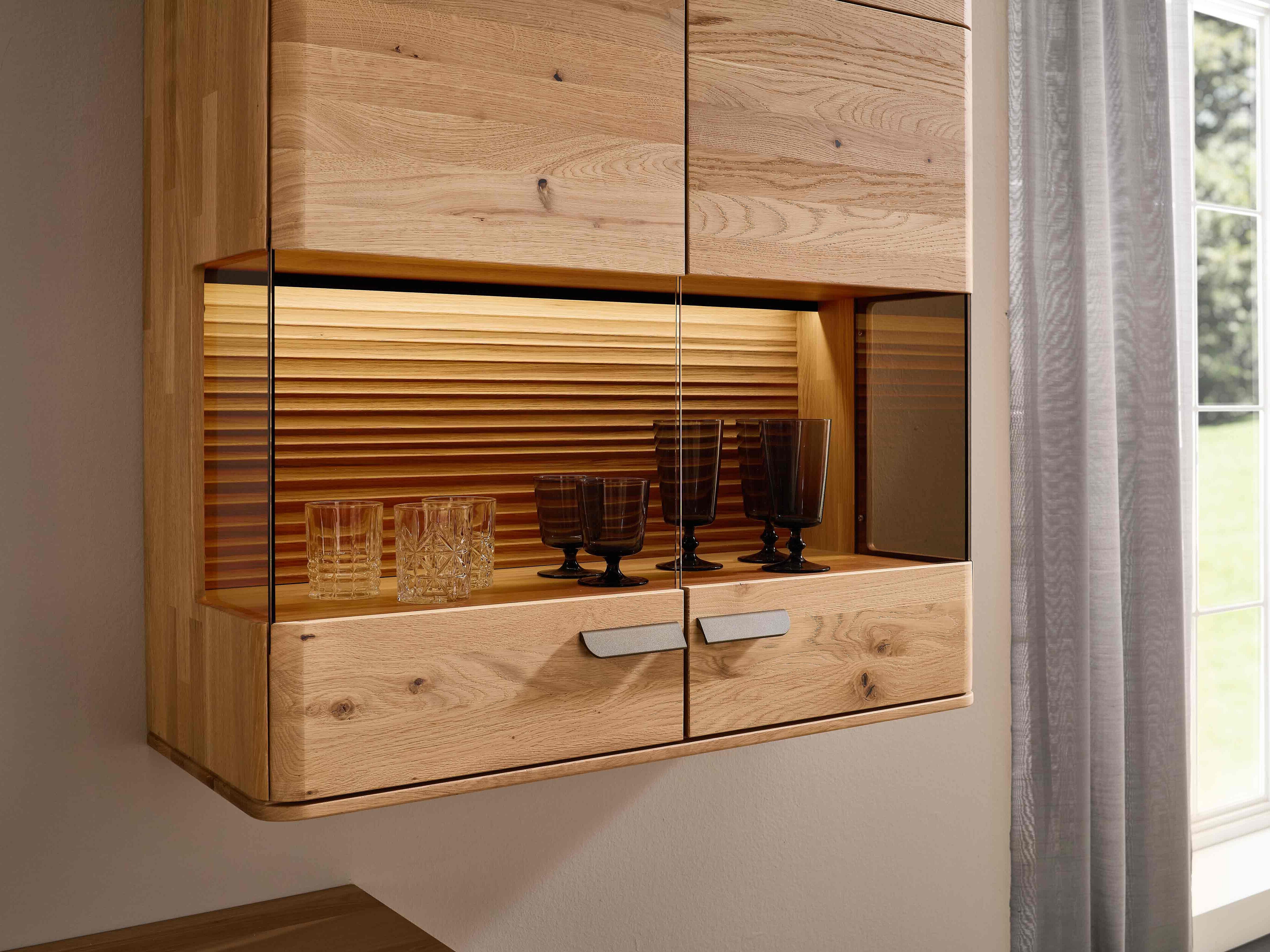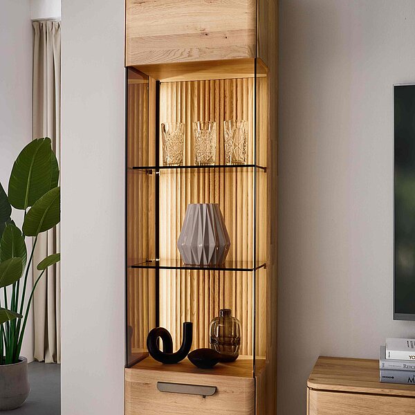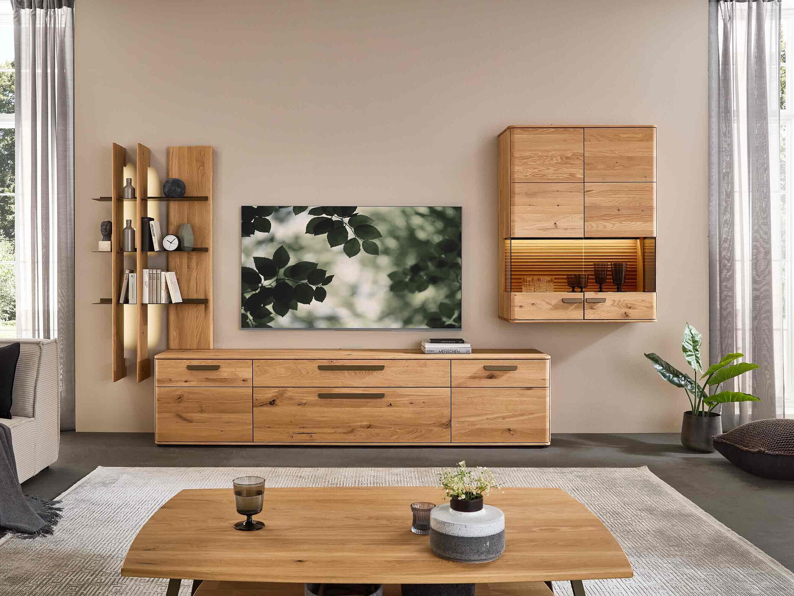 Dieses Möbel steht für ein besonders gemütliches, langlebiges Wohnzimmerdesign. Sichtbare Qualität, spürbare Wertigkeit und ein harmonisches Wohngefühl prägen seine Optik — gemacht für den neuen Mittelpunkt Ihres Zuhauses. Charakteristisch sind die soft abgerundeten Korpusprofilierungen, die für eine ruhige, wohnliche Anmutung sorgen und dem Massivholz eine besondere Leichtigkeit verleihen. Die weichen Linien wirken einladend und wohnlich. Ein besonderes Design-Highlight ist der optionale Rückwand-Akzent in Wellenoptik „Wildeiche Flow“. Er bringt Bewegung und Tiefe ins Möbelbild. In Kombination mit der otionalen LED-Beleuchtung entsteht ein stimmungsvolles Lichtspiel, das ihre Lieblingsstücke in Szene setzt und ihrem Wohnzimmer eine