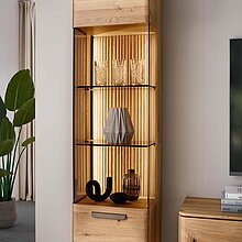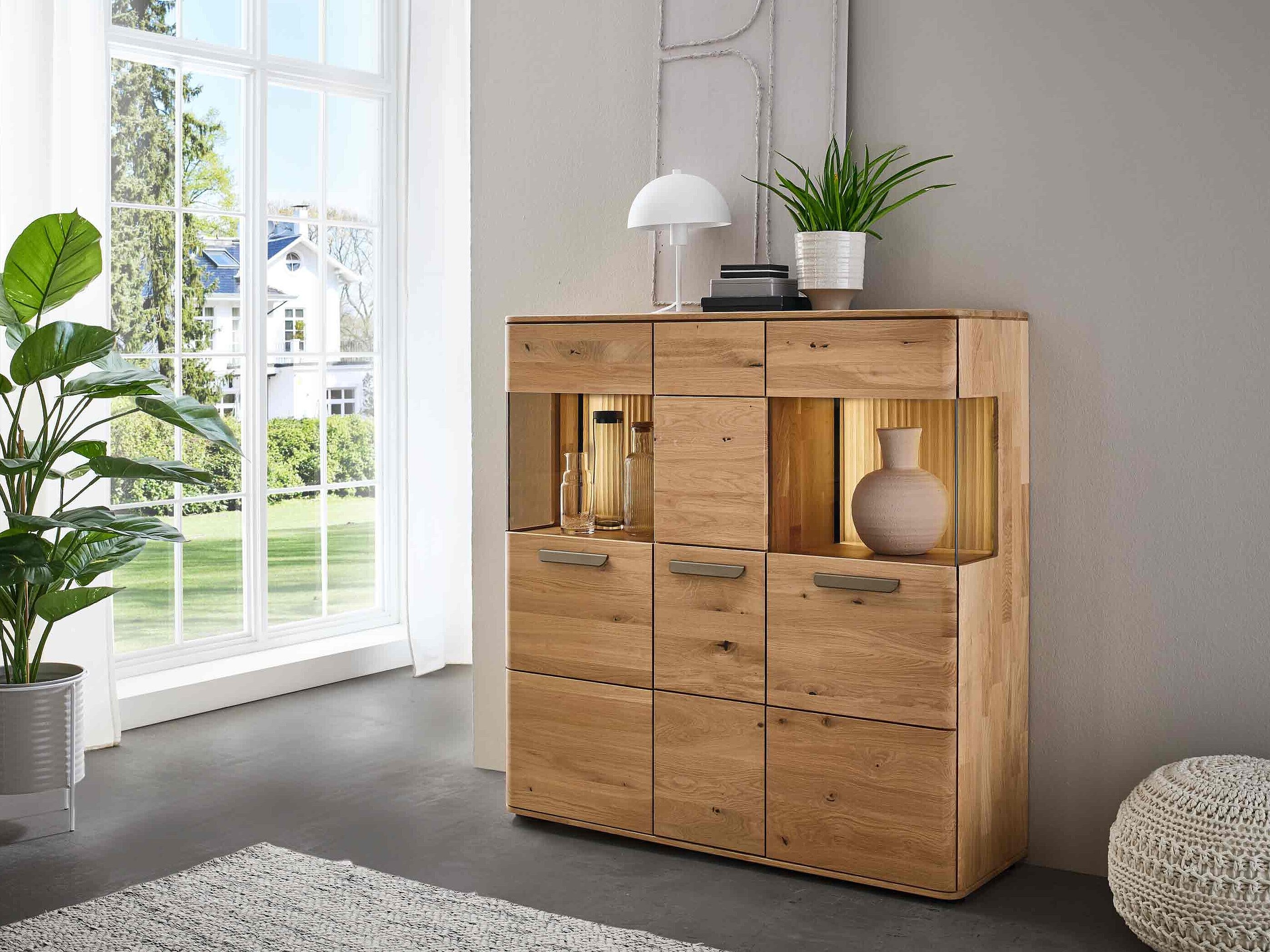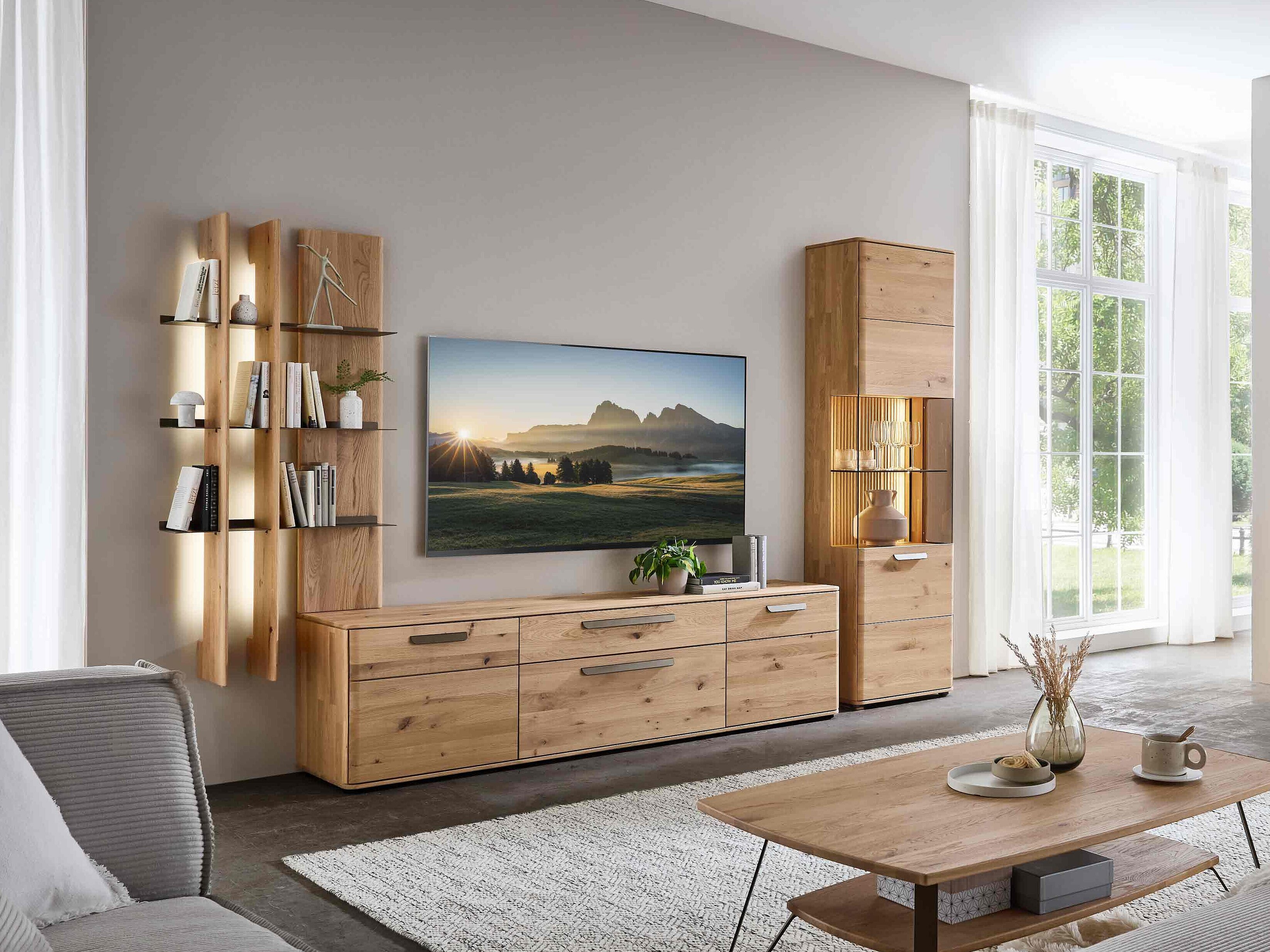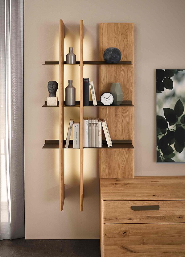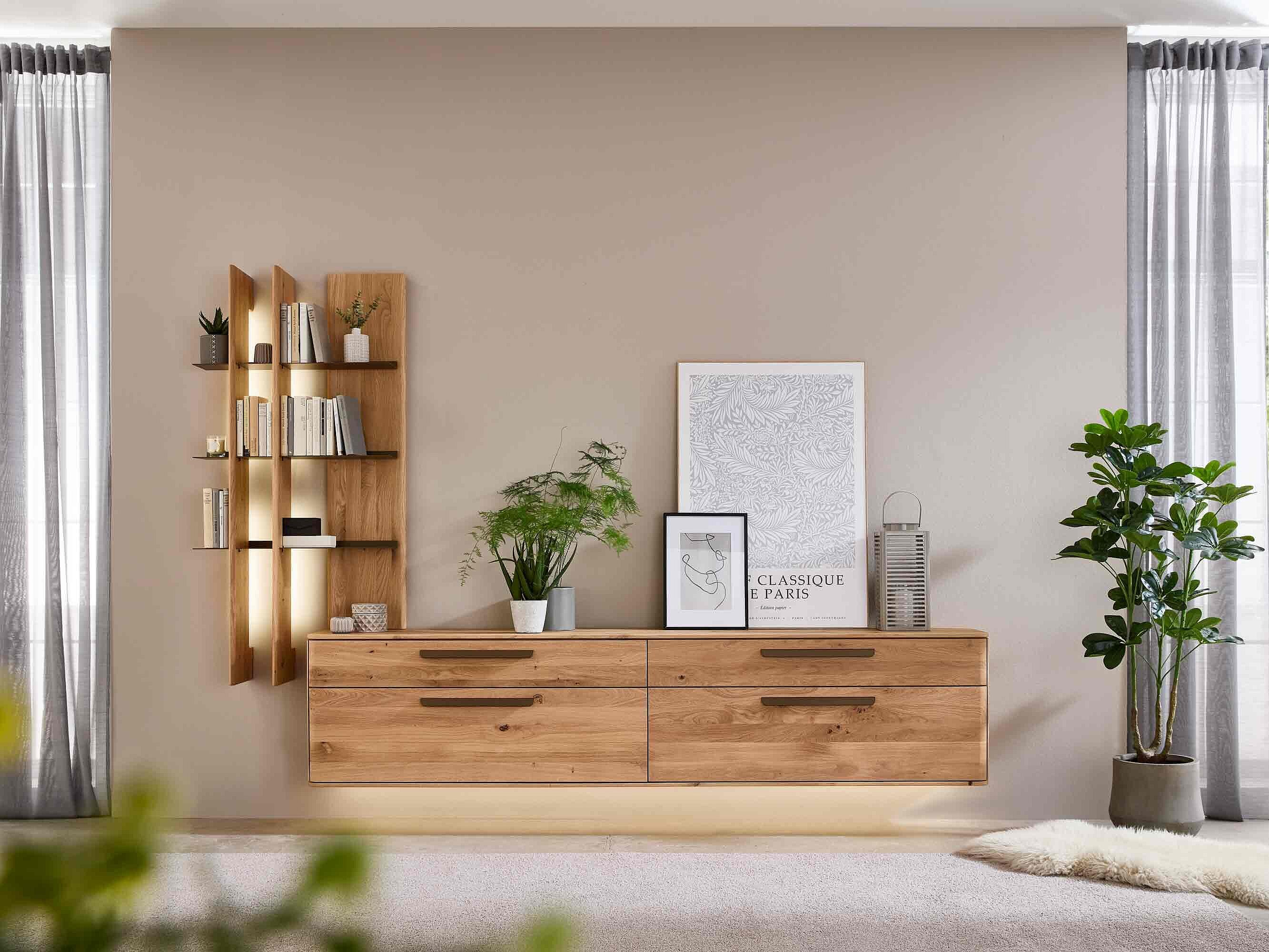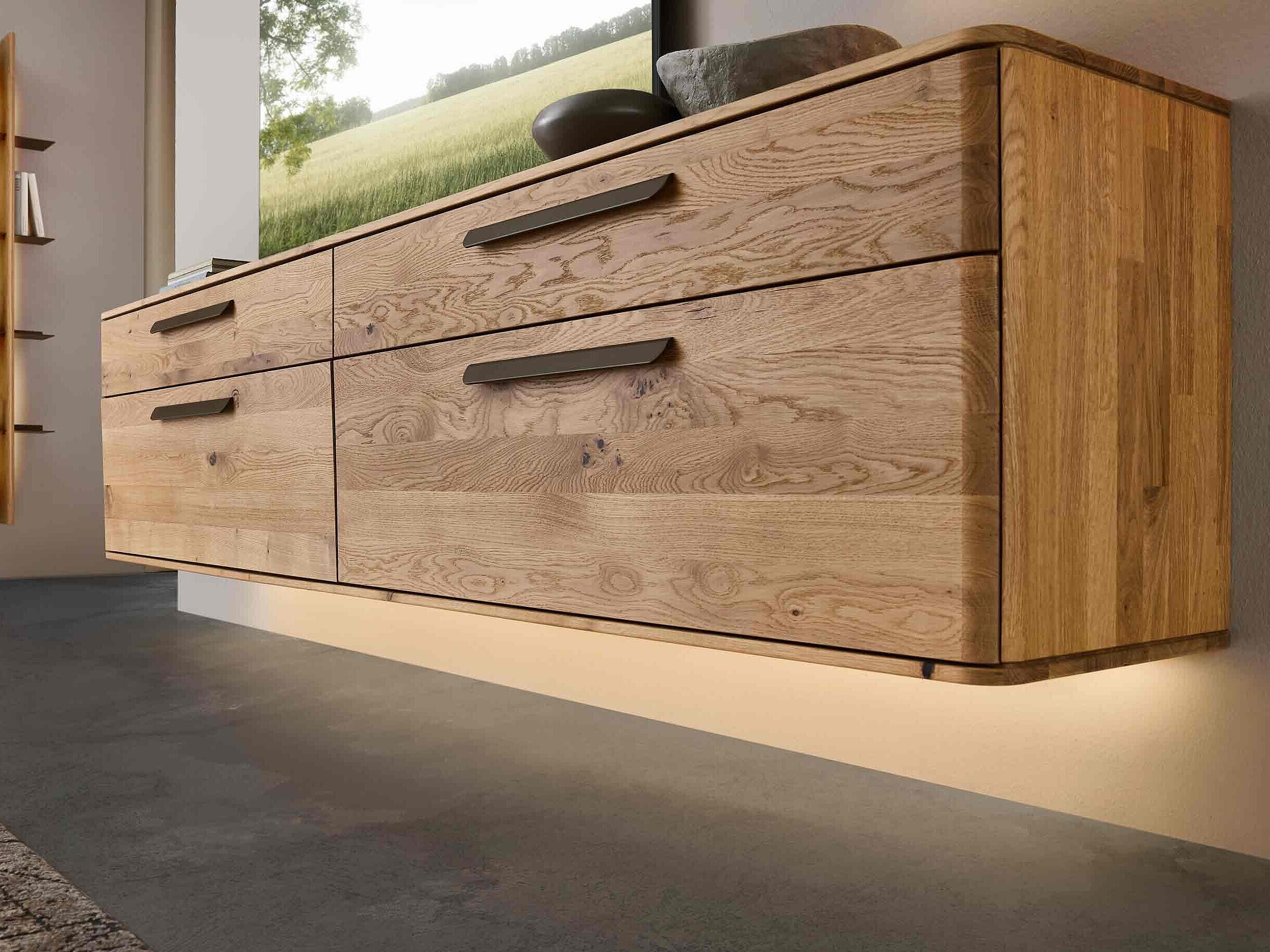 Dieses Möbel steht für ein besonders gemütliches, langlebiges Wohnzimmerdesign. Sichtbare Qualität, spürbare Wertigkeit und ein harmonisches Wohngefühl prägen seine Optik — gemacht für den neuen Mittelpunkt Ihres Zuhauses. Charakteristisch sind die soft abgerundeten Korpusprofilierungen, die für eine ruhige, wohnliche Anmutung sorgen und dem Massivholz eine besondere Leichtigkeit verleihen. Die weichen Linien wirken einladend und wohnlich. Ein besonderes Design-Highlight ist der optionale Rückwand-Akzent in Wellenoptik „Wildeiche Flow“. Er bringt Bewegung und Tiefe ins Möbelbild. In Kombination mit der otionalen LED-Beleuchtung entsteht ein stimmungsvolles Lichtspiel, das ihre Lieblingsstücke in Szene setzt und ihrem Wohnzimmer eine