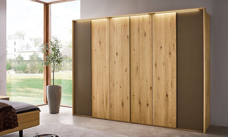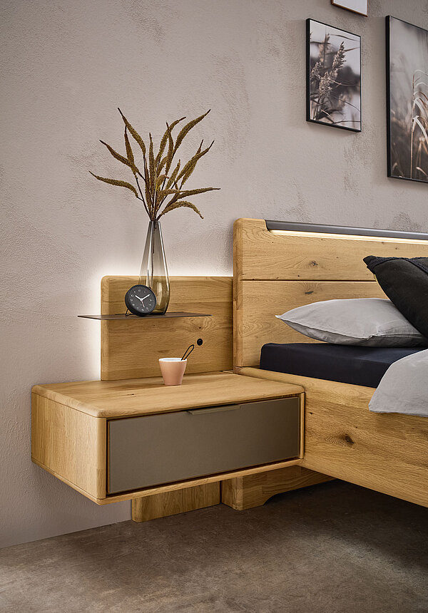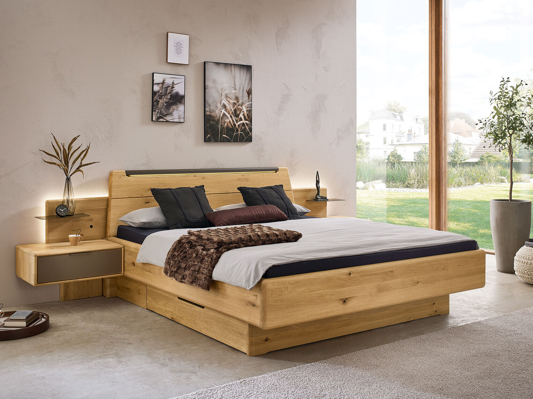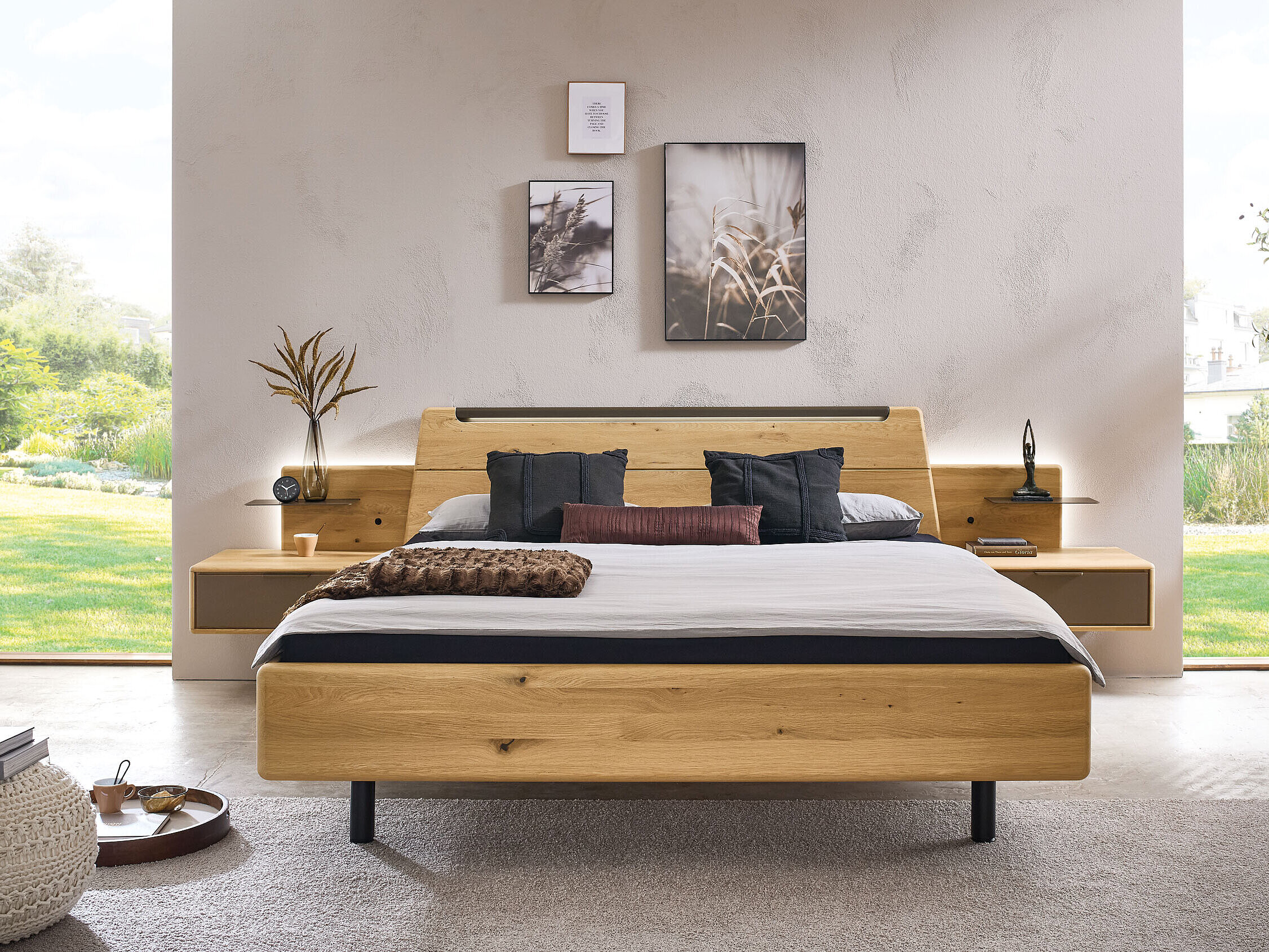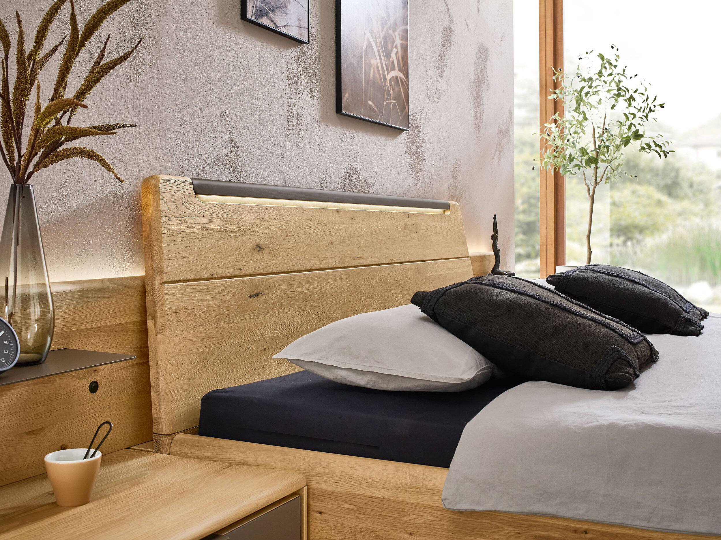 Das Massivholzbett WSM 7100 verwandelt Ihr Schlafzimmer in einen Ort der Ruhe, Wärme und Geborgenheit. Gefertigt aus hochwertigem Massivholz, strahlt es natürliche Eleganz, Beständigkeit und zeitlose Wertigkeit aus. Im Mittelpunkt steht das markante Bett mit seinem kraftvollen Kopfteil. Die integrierte Beleuchtung sorgt für eine sanfte, stimmungsvolle Atmosphäre und schafft ein behagliches Ambiente zum Entspannen und Wohlfühlen. Ein besonderer Blickfang ist der massive Holzakzent am Kopfteil, der im edlen Farbton Bronze lackiert ist und dem Bett eine stilvolle, elegante Note verleiht. Die schwebenden Nachtkonsolen unterstreichen die moderne Leichtigkeit des Designs und sorgen für eine harmonische Gesamtwirkung. Optional kann der Mattglas-Akzent auch für die Schubkästen der Konsolen gewählt werden. So entsteht ein stilvolles Zusammenspiel aus natürlichem Massivholz, bronzefarben lackierten Holzakzenten und edlem Mattglas. Das Ergebnis ist ein Schlafzimmer, das nicht nur durch sein ausdrucksstarkes Design überzeugt, sondern auch durch hochwertige Materialien und durchdachte Details.
