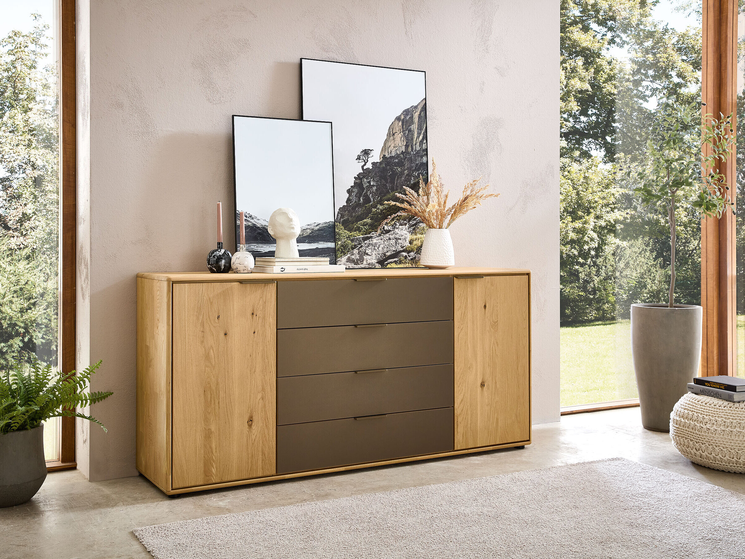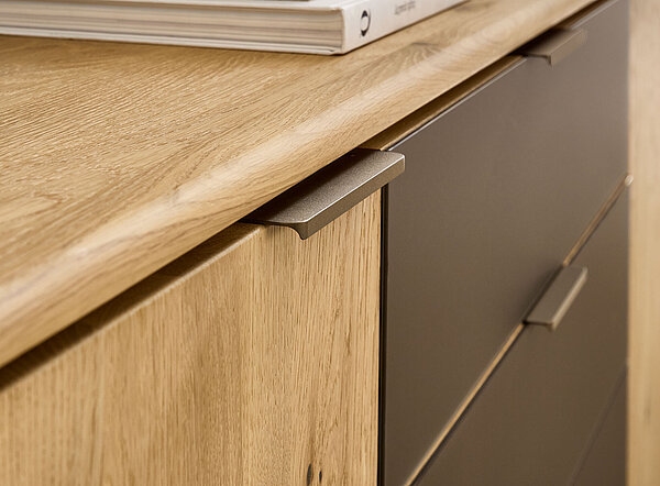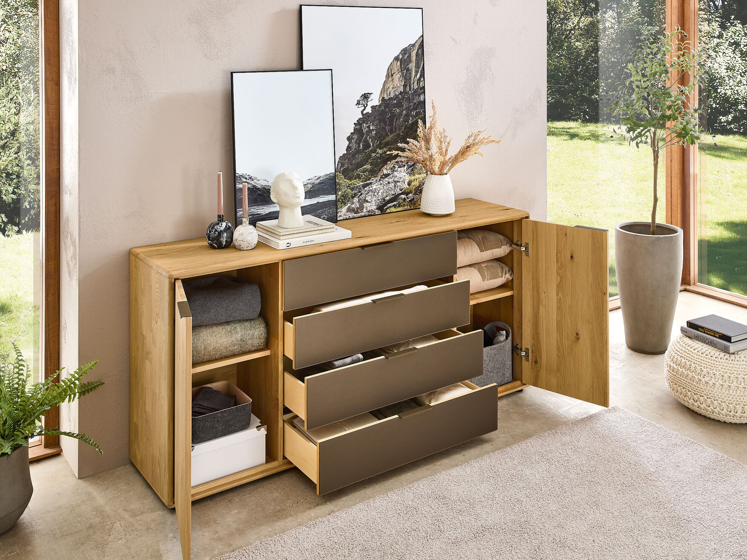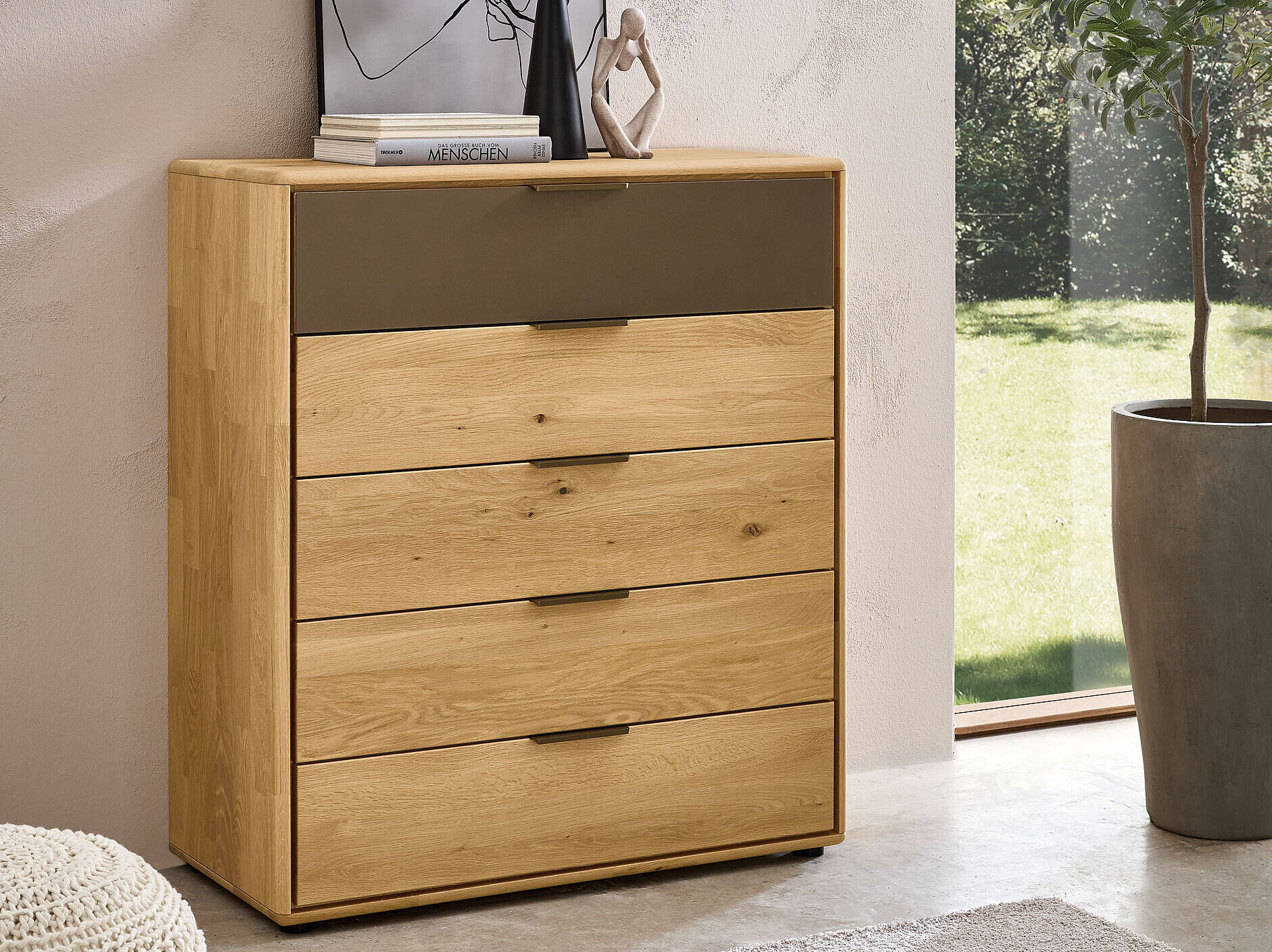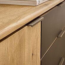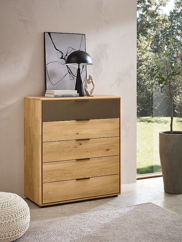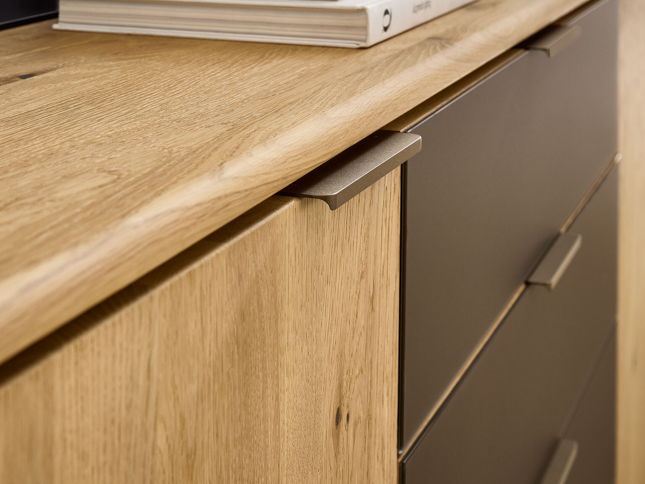Die Kommoden aus unserer Modellreihe WSM 7100 überzeugen durch ihre hochwertige Verarbeitung aus massiver Wildeiche vereinen natürliche Wärme mit modernem Design. Die lebendige Maserung des Massivholzes verleiht jedem Möbelstück einen individuellen Charakter und sorgt für eine besonders wertige Ausstrahlung. Ein elegantes Highlight bilden die Mattglas-Applikationen in Bronze an den Fronten. Sie setzen stilvolle Akzente und schaffen einen harmonischen Kontrast zum natürlichen Holz. Gleichzeitig verleihen sie den Kommoden eine moderne und edle Optik. Die Kommoden bieten nicht nur eine ansprechende Gestaltung, sondern auch Langlebigkeit und hohe Qualität. Sie fügen sich ideal in verschiedene Wohnbereiche ein und verbinden praktischen Stauraum mit zeitloser Eleganz.