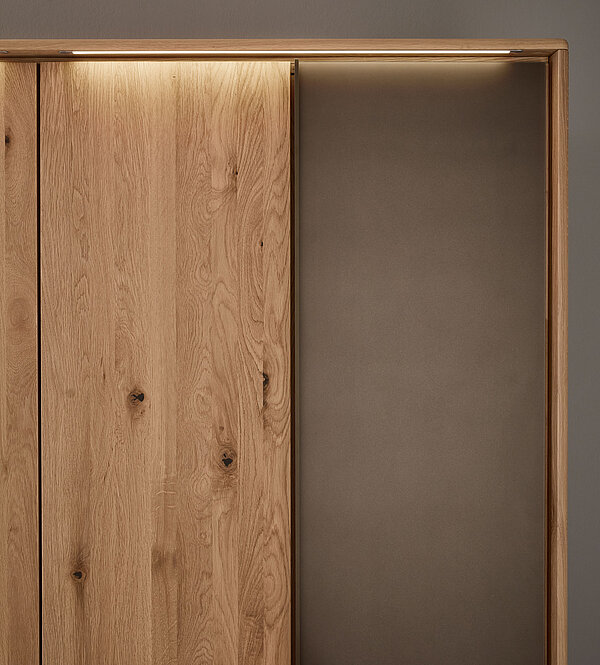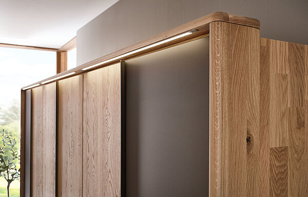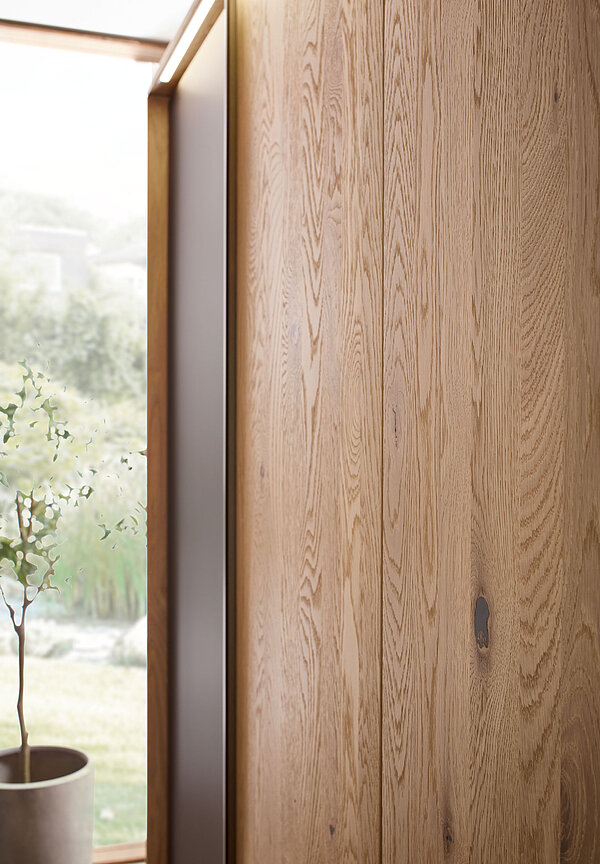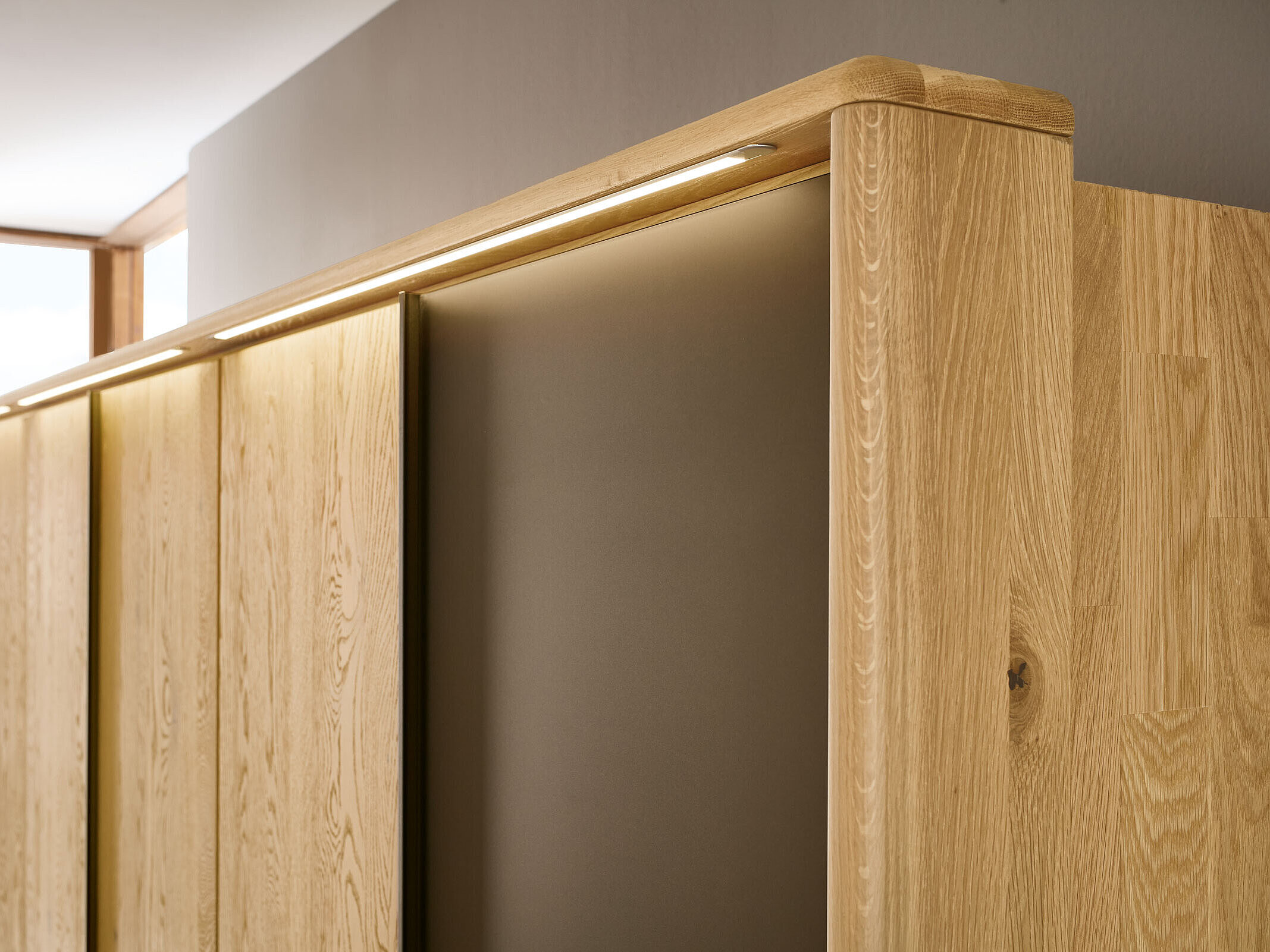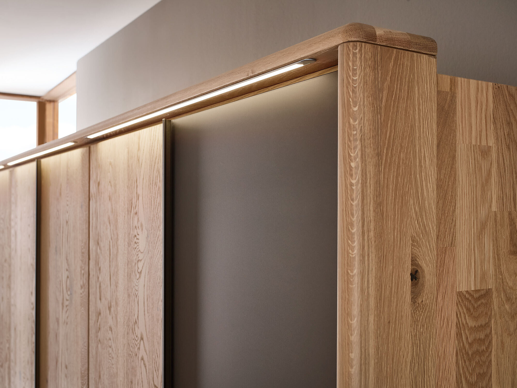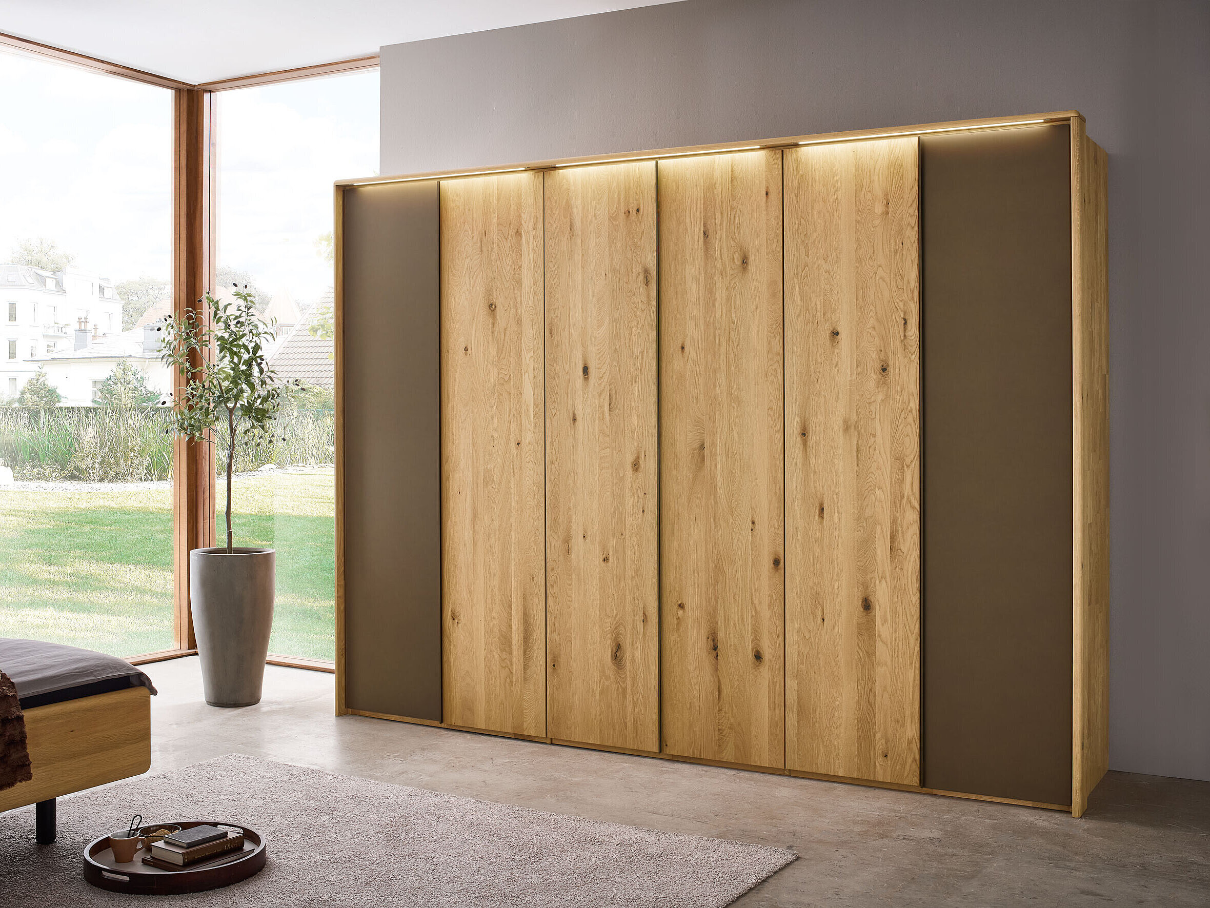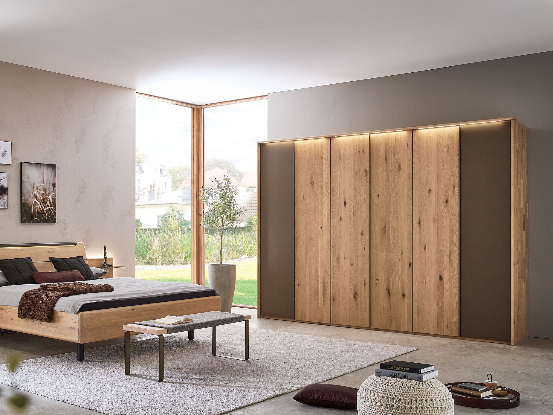Der Kleiderschrank WSM 7100 verbindet natürliche Materialien mit modernem Design und wird zu einem stilvollen Mittelpunkt Ihres Schlafzimmers. Gefertigt aus hochwertigem Massivholz strahlt er Wärme, Natürlichkeit und Beständigkeit aus und überzeugt zugleich durch seine hochwertige Verarbeitung. Klare Linien und warme Holzfronten verleihen dem Schrank eine zeitlose Ausstrahlung, während großzügiger Stauraum für Ordnung und Übersicht sorgt. Ein besonderer Blickfang sind die eleganten Akzente aus bronzefarbigen Mattglas, die dem Design eine edle und moderne Note verleihen. Die Kombination aus natürlichem Massivholz und bronzefarbenem Mattglas schafft ein harmonisches Gesamtbild, das Ruhe und Eleganz ausstrahlt. Hochwertige Materialien und durchdachte Details sorgen dabei nicht nur für eine ansprechende Optik, sondern auch für langlebige Qualität und hohen Komfort im Alltag. So entsteht ein Kleiderschrank, der Funktionalität, Design und natürliche Materialien auf stilvolle Weise miteinander verbindet und Ihr Schlafzimmer zu einem Ort der Ordnung und des Wohlfühlens macht.